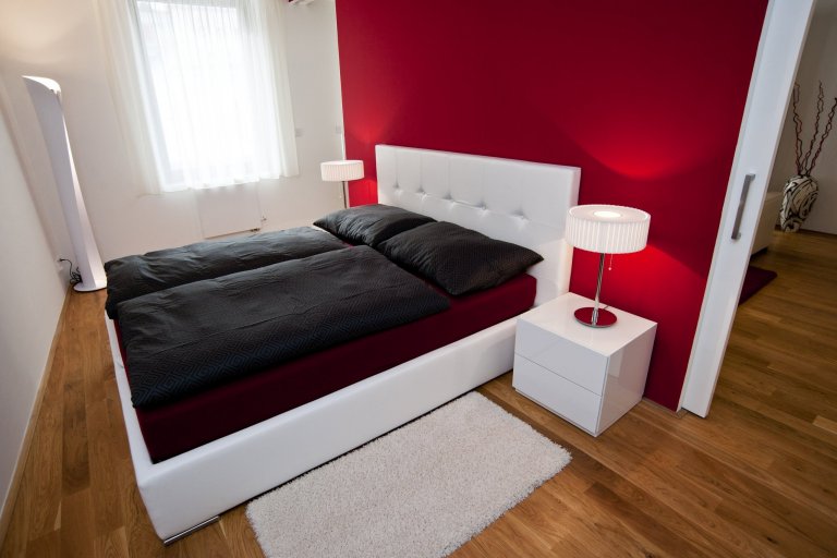 Popis vybavení: Na podlaze je položena masivní dubová parketová podlaha v olejové povrchové úpravě. Naše realizace obsahovala návrh, výrobu a montáž atypického nábytku lakovaného do vysokého lesku, včetně velkého jídelního stolu a kůží luxusní celočalouněné postele.
