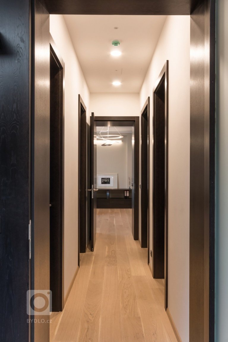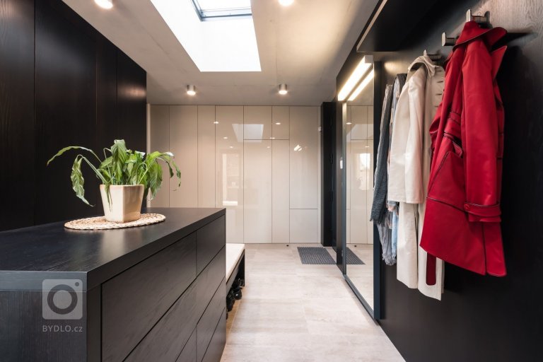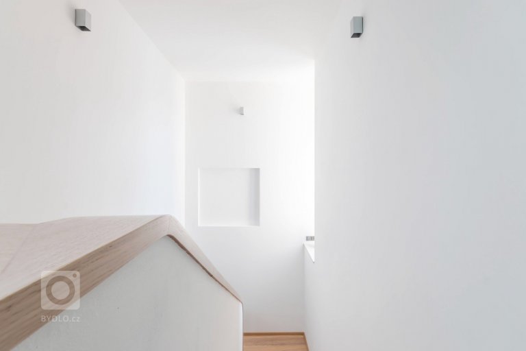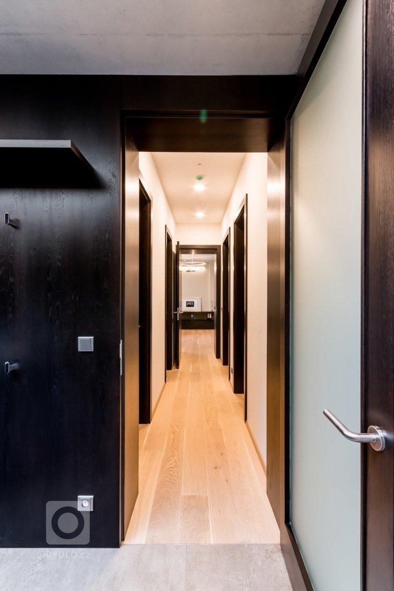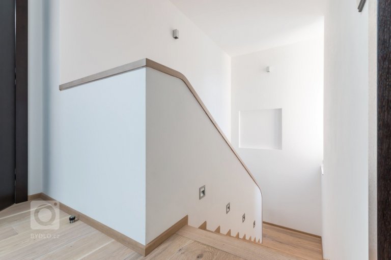Popis vybavení: Na podlahy domu a schodiště byla položena bělená dubová parketová podlaha, bezfalcové dveře a zárubně s atypickou výškou jsme vyrobili rovněž dubové dýhované a mořené na tmavý odstín. Tento dekor spolu s plochami lakovanými do vysokého lesku dominuje celému interiéru. Technickou specialitou bylo zapracování TV stěny v obývací části do materiálu použitého na podlahu a neviditelné kotvení lankového systému sloužícího jako zábrana proti pádu ze schodiště.