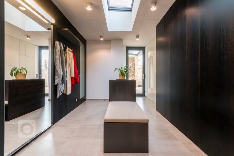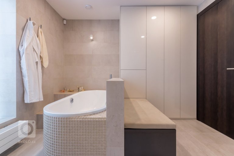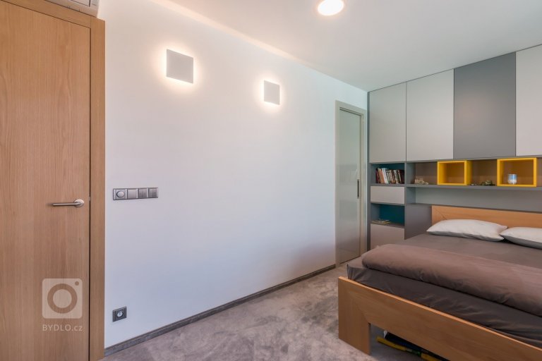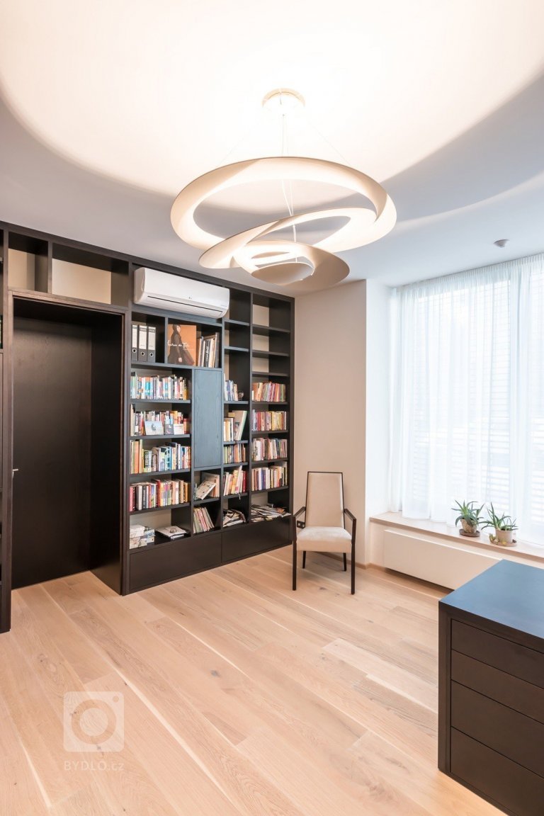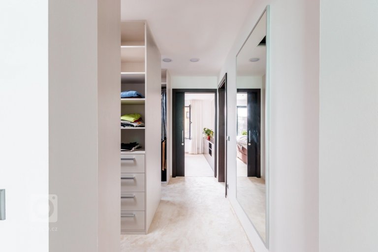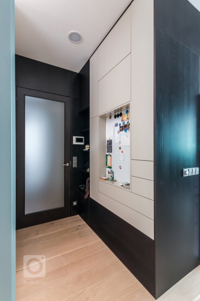 Popis vybavení: Na podlahy domu a schodiště byla položena bělená dubová parketová podlaha, bezfalcové dveře a zárubně s atypickou výškou jsme vyrobili rovněž dubové dýhované a mořené na tmavý odstín. Tento dekor spolu s plochami lakovanými do vysokého lesku dominuje celému interiéru. Technickou specialitou bylo zapracování TV stěny v obývací části do materiálu použitého na podlahu a neviditelné kotvení lankového systému sloužícího jako zábrana proti pádu ze schodiště.