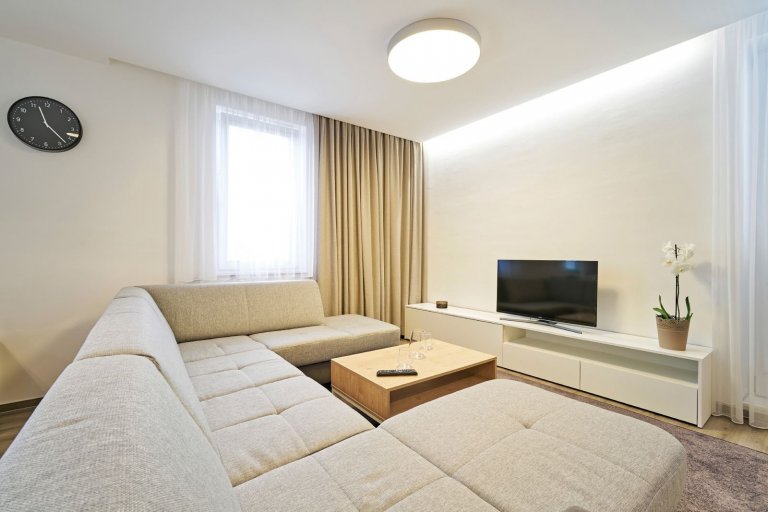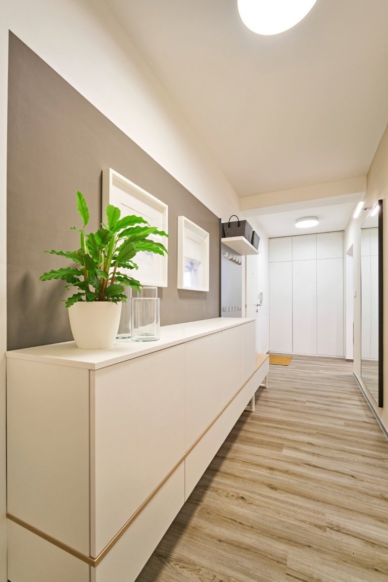 Majitel bytu se na nás prozíravě obrátil již v době, kdy byla celková rekonstrukce plánem. Díky tomu jsme mohli osmdesátimetrový byt navrhnout dle jejich představ. Tak, aby splňoval požadavky mladého páru a aby řešil každý detail budoucího interiéru. Zadání znělo: byt pro mladý pár (v budoucnu dvě děti), dostatek úložných prostor, dětský pokoj s nadčasovým designem, klidná ložnice v jemných tónech, obytný prostor s kuchyní a pracovním koutkem, světlá předsíň s vestavnou skříní a samostatné WC.