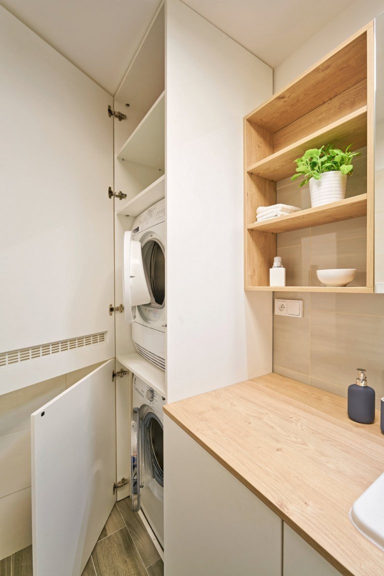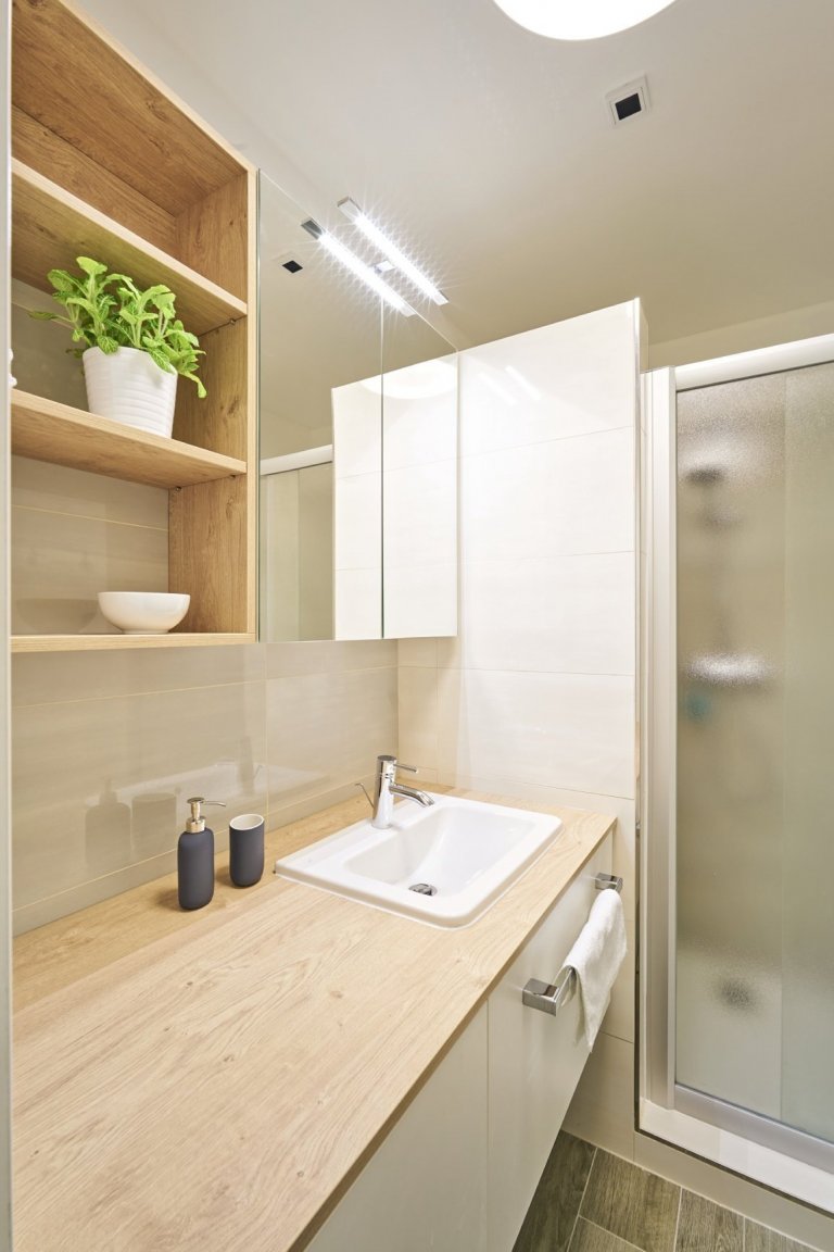Do koupelny si přáli sprchový kout, úložné prostory, pračku se sušičkou. Klienti preferovali barevně i materiálově střízlivý prostor se severskou atmosférou – podmínkou bylo použití cihlových stěn (zvolili jsme formu obkladu). Neměnnými se staly pouze nosné zdi, pozice a velikosti oken, instalační šachty a vchodové dveře. Stavební úpravy zasáhly podlahy, stěny, rozvody instalací, některé příčky. Díky tomu mohl vzniknout otevřený a vzdušný prostor pro kuchyň, obývací pokoj a pracovní koutek.