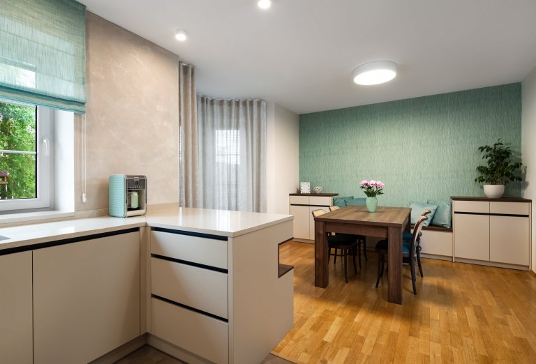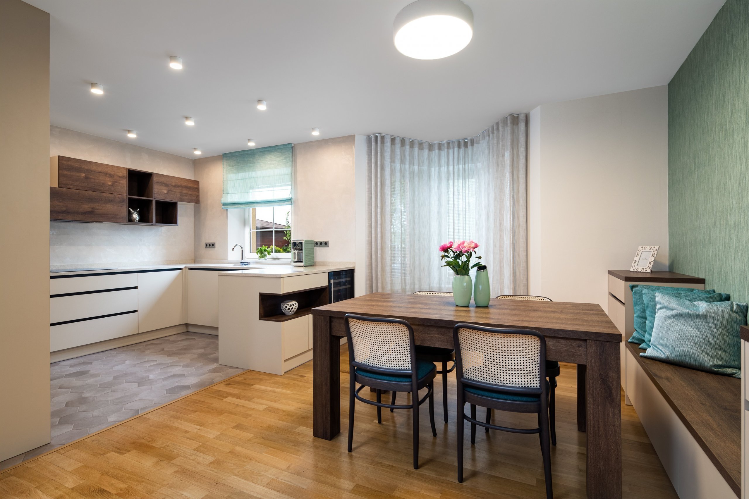 Majitelé mě oslovili s žádostí o kompletní rekonstrukci kuchyně v rodinném domě. Z původního prostoru jsme zachovali pouze dřevěnou podlahu v jídelně.