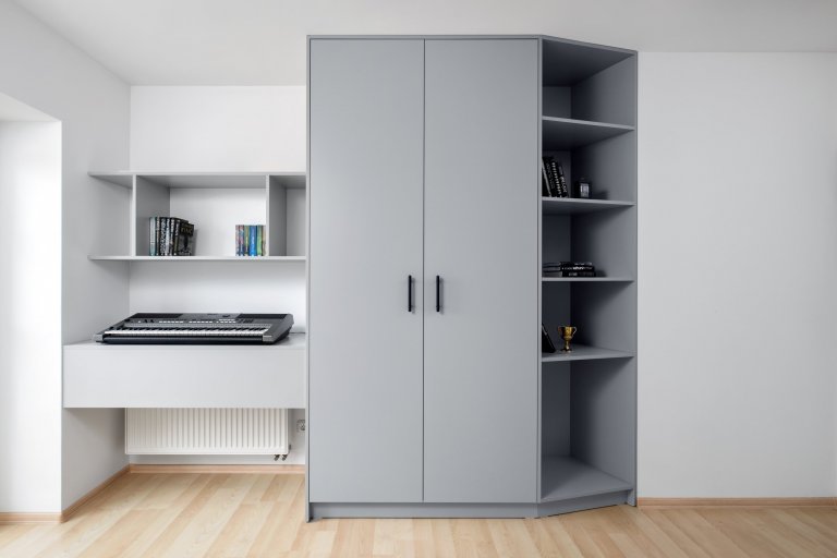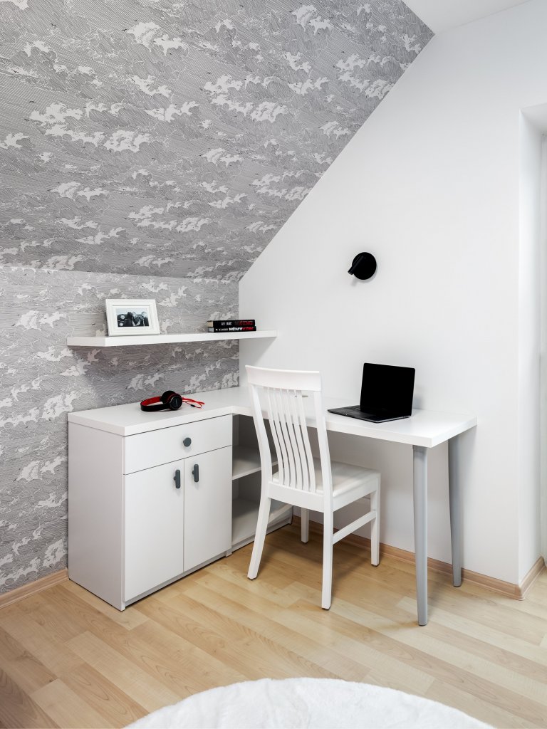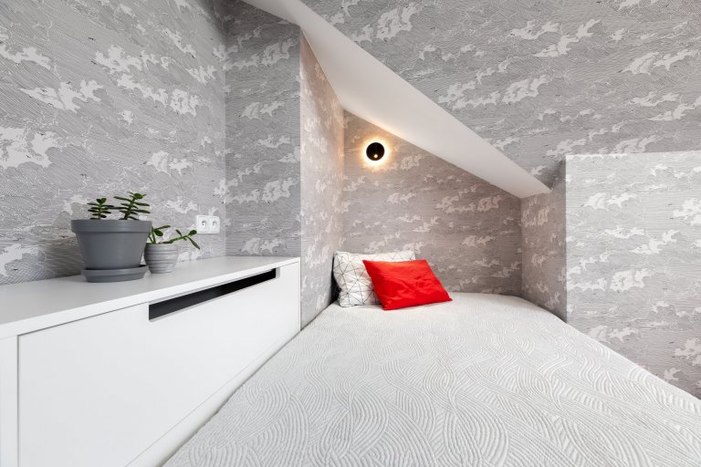 Pro menší podkrovní prostor se spoustou šikmin a výklenků jsem navrhla veškerý nábytek na míru. Pro čerstvého studenta gymnázia jsem volila neutrální barevné schéma bílé a šedé. Pod šikminou je umístěna postel š. 120cm na míru, s úložným prostorem pod lůžkem a peřiňákem z boku postele. Atmosféru prostoru dodává grafická tapeta s mraky a designové černé osvětlení.