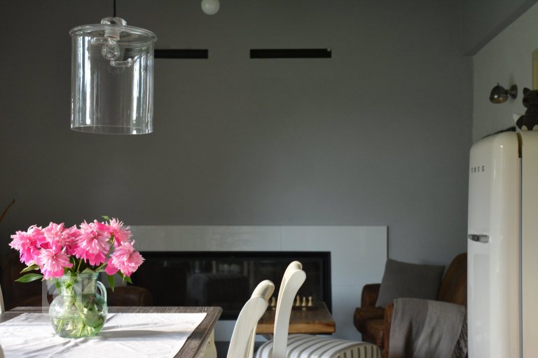Detail na na obýváková kout s koženou sedačkou a krbem s panoramatickým prosklením.