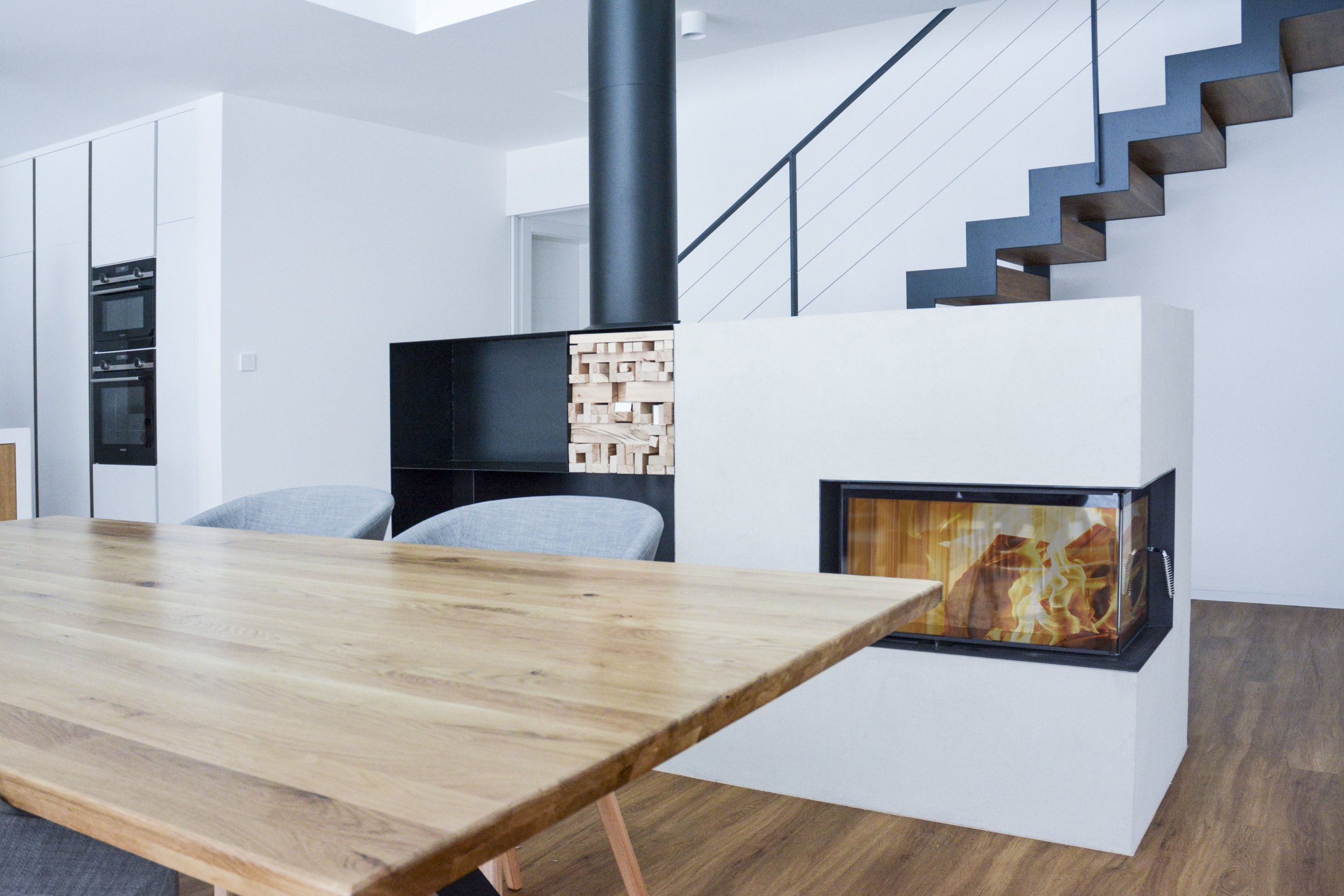 Obestavba rohové kamnové vložky Brunner HKD 11. Vložka je doplněna tahovým systémem Brunner MSS. Krb zdobí pouze kovové police. To vše realizovalo Kamnářství Koutecký. Komínové těleso je značky…