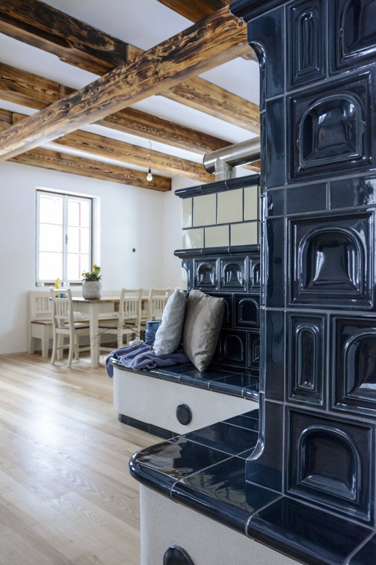 Kachlový sporák v lehce provensálském stylu, realizace Mojmír Jauernig. Součástí sporáku jsou také dvě trouby. Při stavbě byly použity kachle K&K POKER, Kamnářství Bechyně typ Fazeta. Za rohem v modré glazuře kachle typu Kazeta .