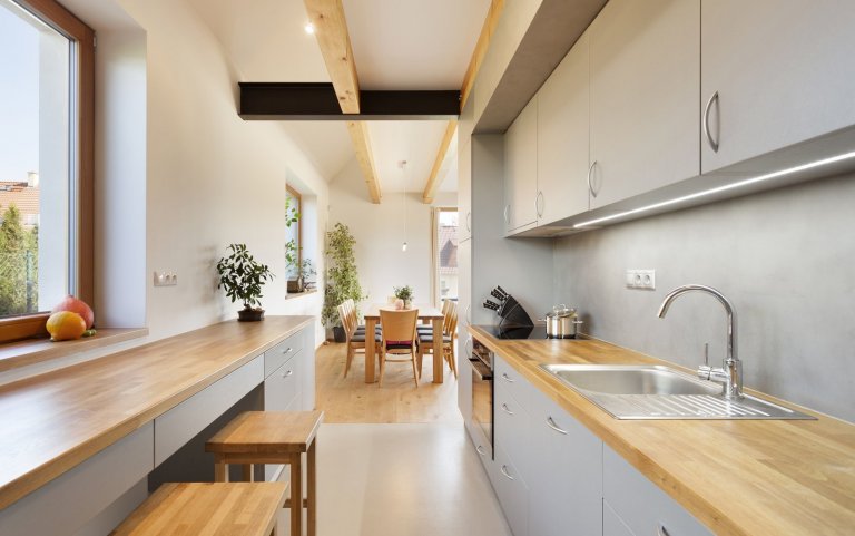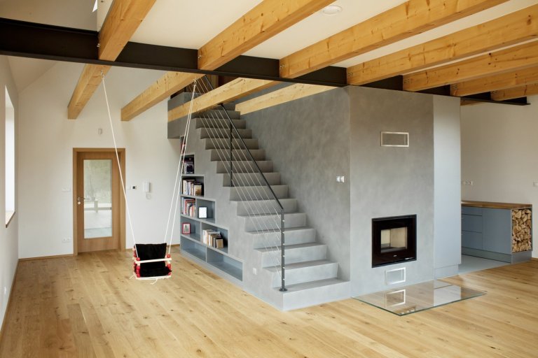 Jednoduchá figura domu je čitelná nejen zvenčí, ale i zevnitř. A to především díky otevřenému stropu ve střední části a vynecháním krajních polí stropní konstrukce obytného prostoru v přízemí. Vznikl tak velkorysý prostor, v jehož středu je “pec” soustřeďující zdroje veškerého tepla v domě. A tak jako se chodívalo na pec spát, tak i zde se stoupá po tělese pece do ložnic. Vizuální sjednocení povrchů exteriéru a interiéru posiluje celkový výraz domu.