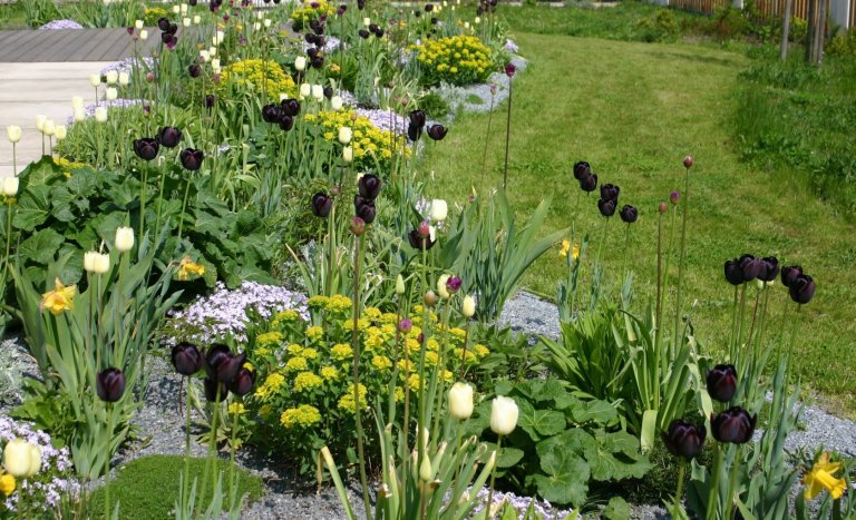 Zahrada rozvíjí klíčové ideje, které formovaly podobu domu. Pracuje s výhledy z pobytových míst domu a zahrady do okolní krajiny. Motiv tradičního venkovského stavení v soudobé podobě rozehrává do podoby tradiční venkovské zahrady s moderním výrazem. Myšlenku nezávislosti domu na dodatkových energiích z vnější rozvíjí v zahradě maximálně přizpůsobené místním podmínkám, která nevyžaduje výměny půdního substrátu, intenzivní závlahu či hnojení. Uplatňují se zde bylinný trávník, suchomilná květnatá louka, extenzivní trvalkové záhony s vyšší mírou autoregulace, dřeviny nacházející se v okolní krajině a tedy nejlépe prosperující v místních podmínkách.