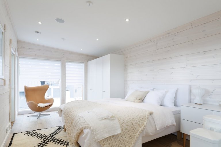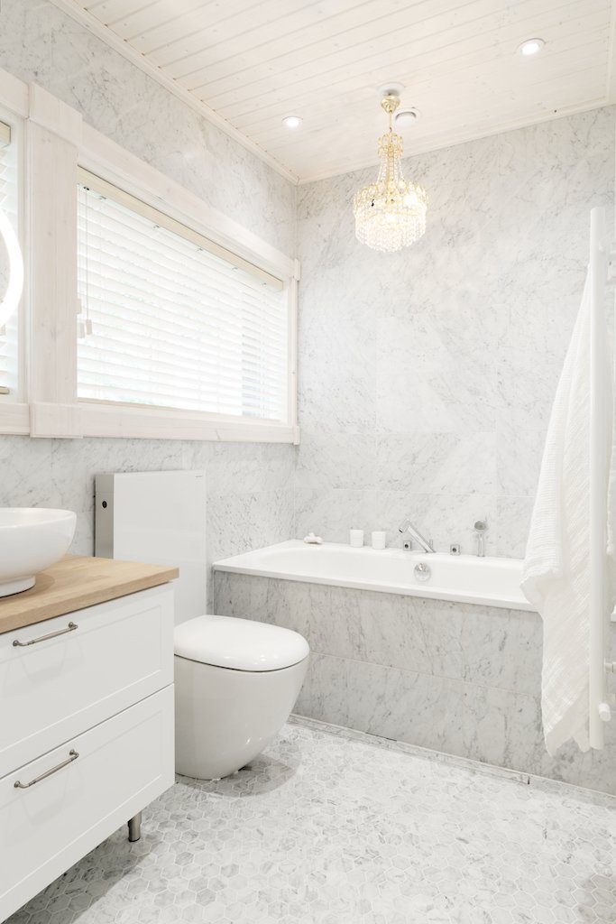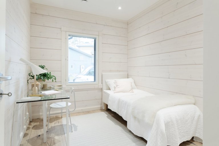 Vlastnící domu milují parkety, a tak téměř všechny podlahové plochy sestávají z parket, tedy kromě těch, ploch, které se dostávají do styku s vlhkostí. Parkety jsou rustikální, dubové a pocházejí z malé rodinné továrny v Mikkeli. V rodinném domě Toive převládají různé odstíny bílé. Bílá barva se báječně hodí do vzdušného patra, kam díky velkým oknům, proudí přirozené světlo ze tří stran. Koupelna je obložena nádhernými dlaždicemi z bílého mramoru od Tulikivi. Přírodní kámen je pod bosýma nohama hebounký a podtrhuje uklidňující atmosféru koupelny.