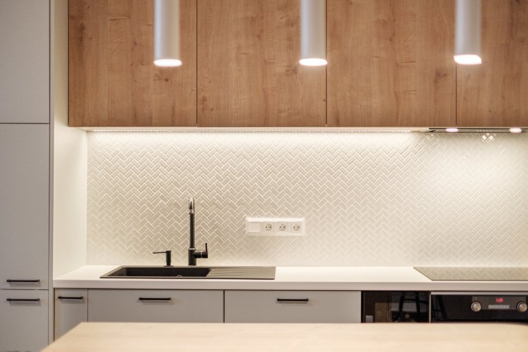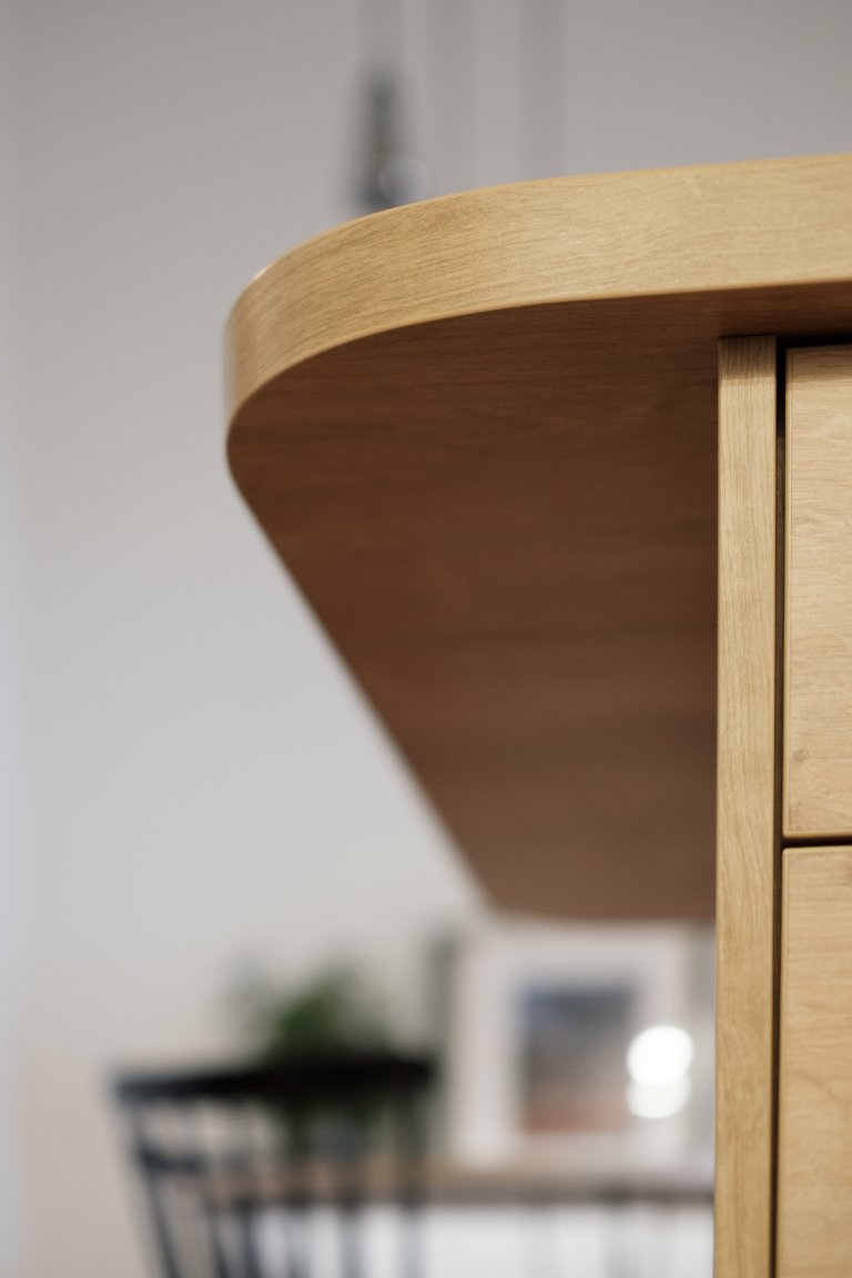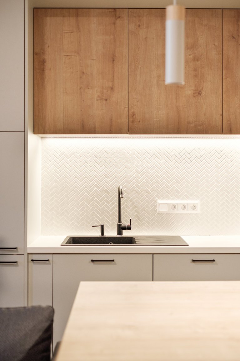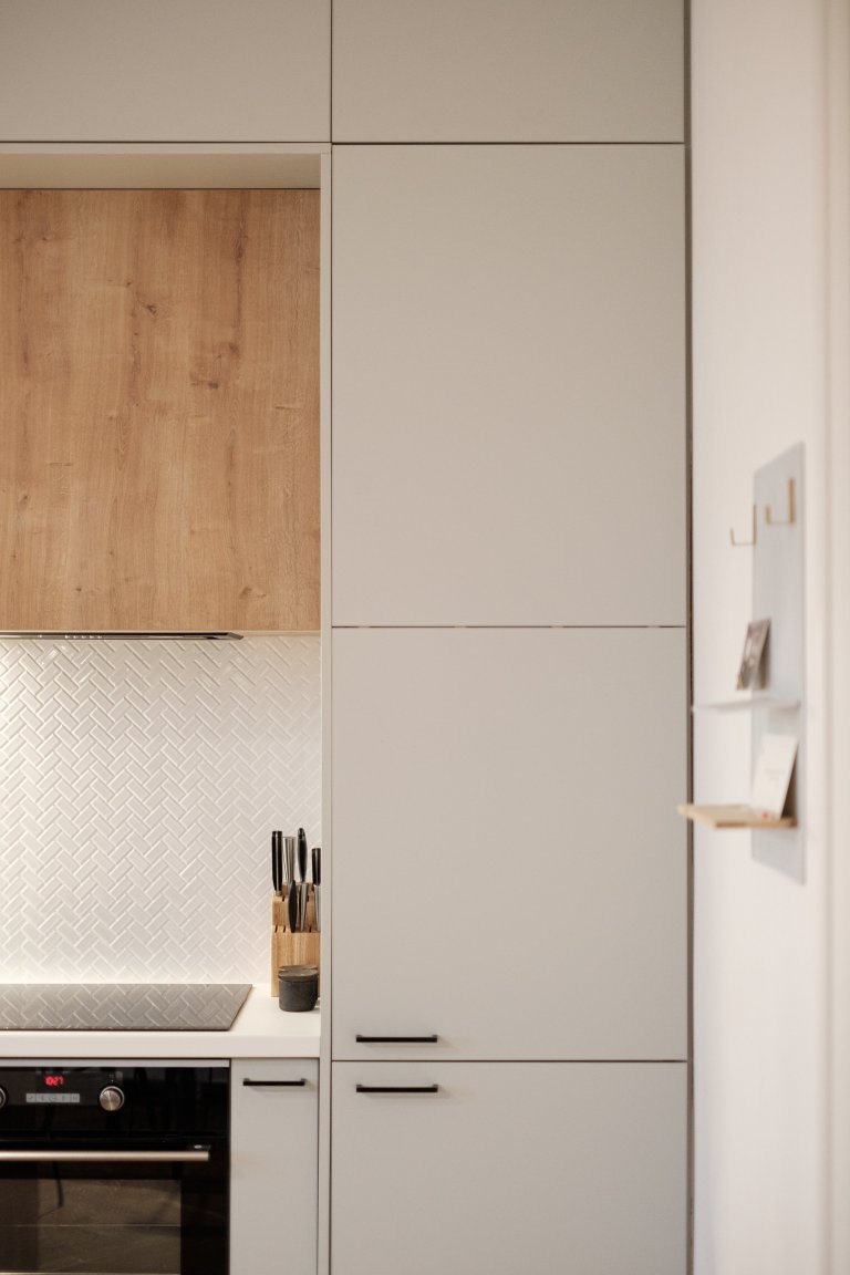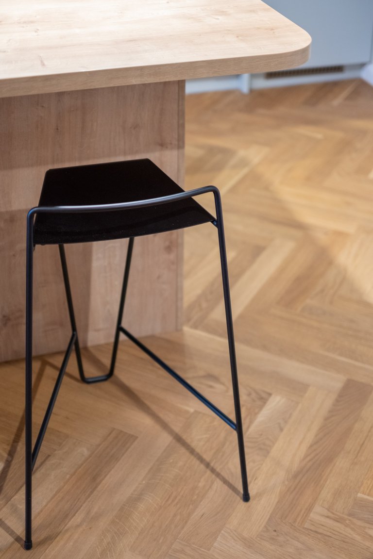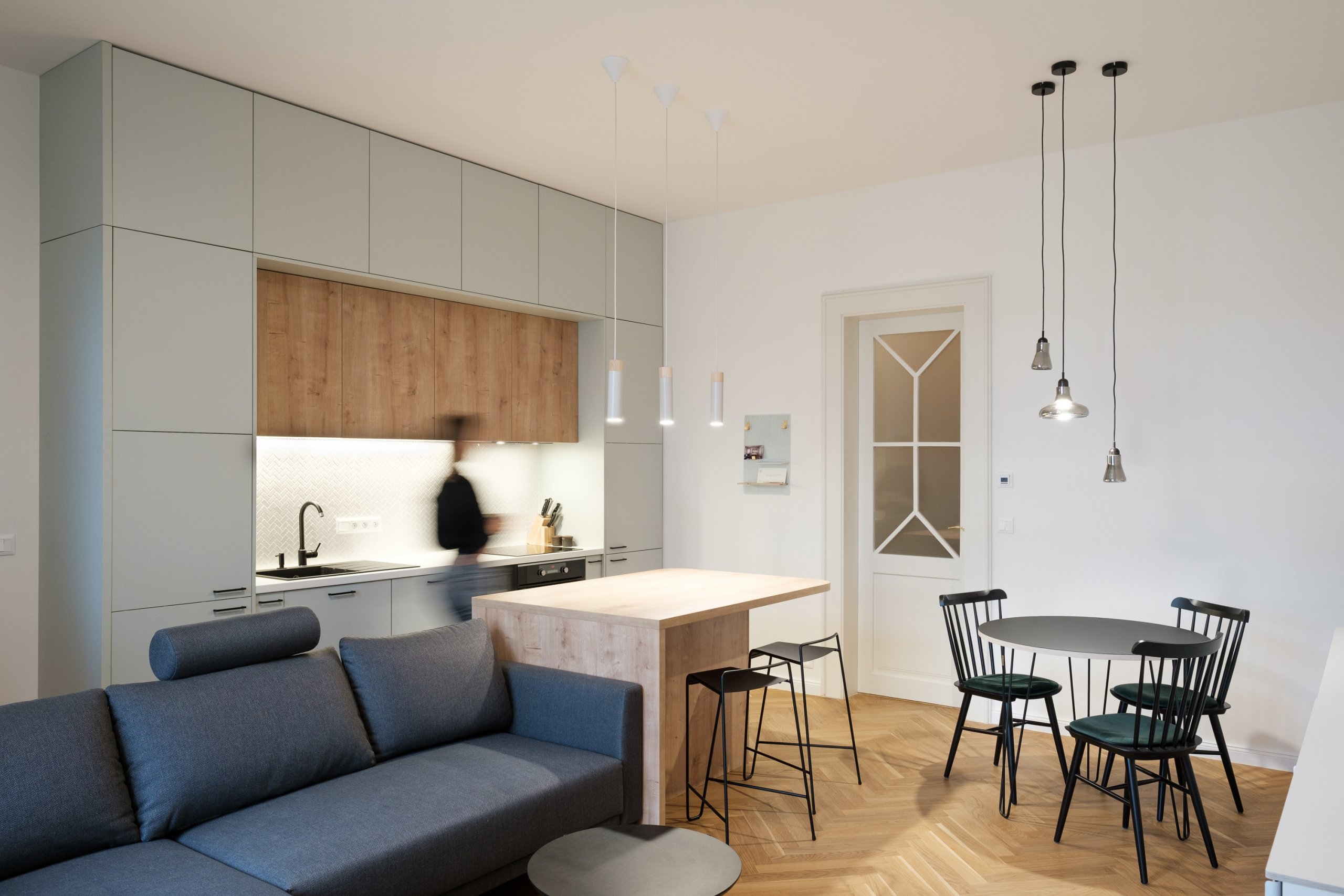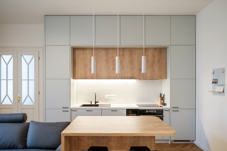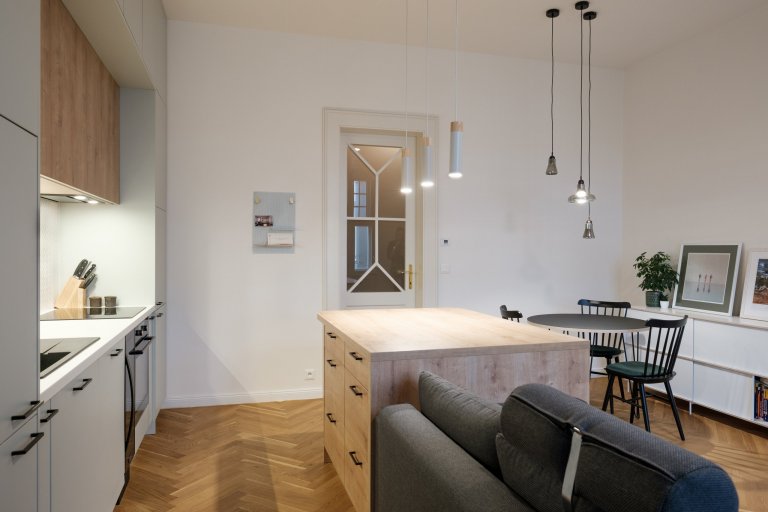 Když se podíváte na pokoj, ve kterém bylo cílem vybavit ho kuchyní s dostatkem úložného a pracovního prostoru, jídelní a sedací soupravou s televizí, je nutné zmínit počet dveří v místnosti. Skoro na každé zdi se nachází například i dvoukřídlé dveře vedoucí do řešené místnosti, do vedlejší ložnice anebo na balkon. Toto rozložení vymezuje prostory, do kterých je možné umístit nábytek a volně se v nich pohybovat. A proto byl návrh koncipován tak, aby se zde vešli všechny funkce, ale prostor nepůsobil zaplněně. V realizaci je vidět, jak se dá sedací souprava od českého výrobce Jech obíhat, a tak vyjít na balkon bez toho, aby se muselo něco přesouvat. Plynule na tuto pohovku navazuje kuchyňský ostrůvek s barovým posezením a tak „zakrývá" pohled od předsíně přímo na pohovku.