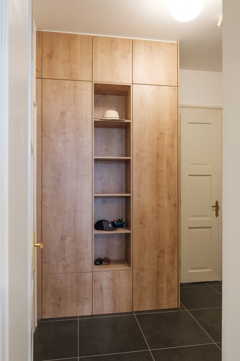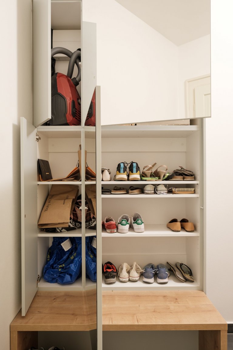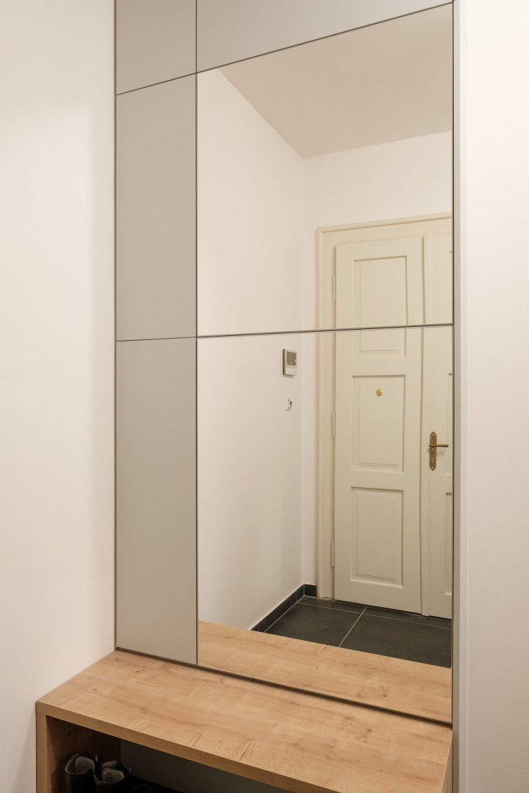V předsíni je častým cílem nenápadně zakrýt technické dvířka od rozvaděčů anebo vstupu k vodoměrům a podobně. Zde je navržená mělká skříňka se zrcadlem, za kterým se skrývají úložné prostory pro boty, a právě přístup do těchto malých prostor. Také je zde dostatek pro sedící část, která slouží také jako vymezené místo pro denně nošené boty. Na protější straně bylo možné vytvořit dostatečně hlubokou šatní sestavu na všechny potřebné vybavení bytu a také šatstvo.