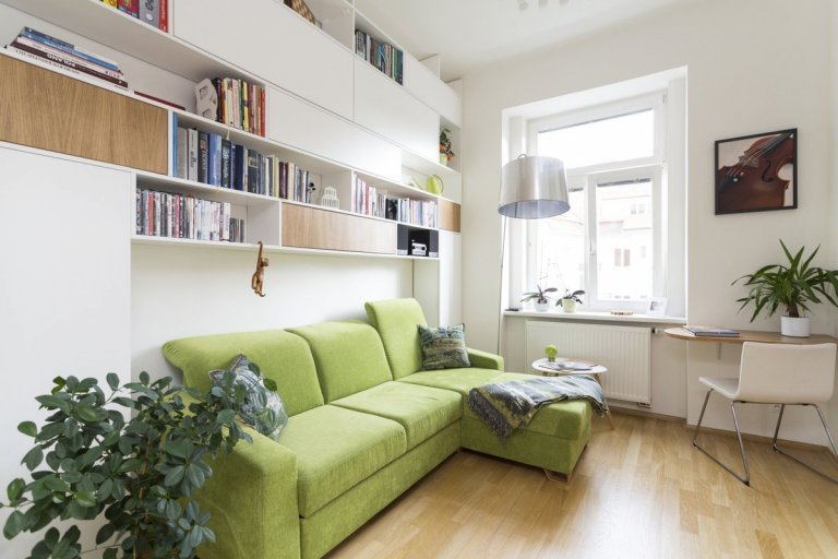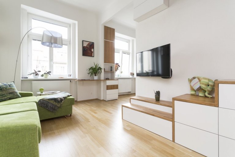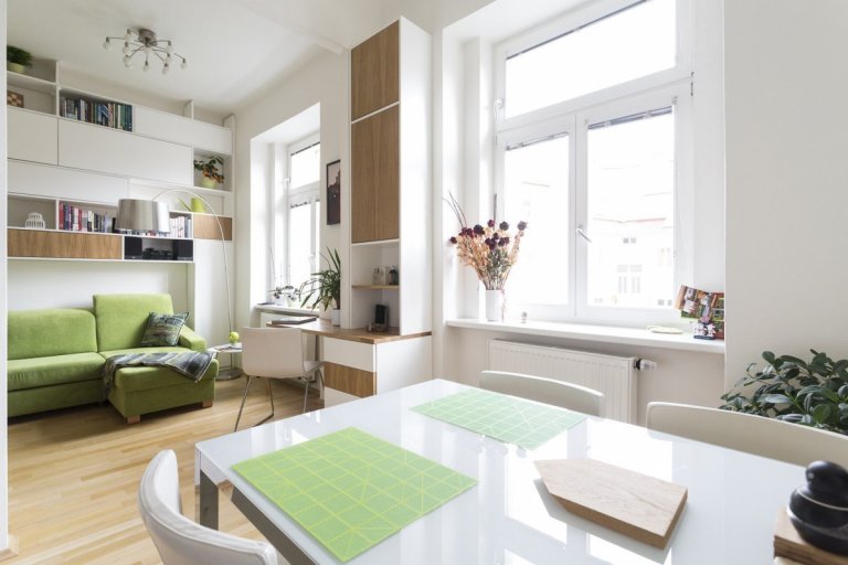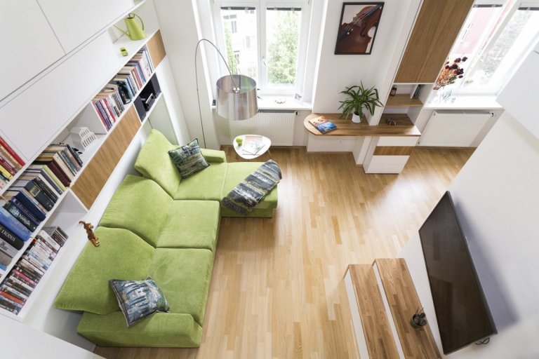 Projekt interiéru malého bytu, kde bylo třeba využít všech volných ploch a sjednotit již postavené patro na spaní s obývacím pokojem. Pod patrem byla vestavná skříň se zrcadlovými dveřmi, kterou si majitelka přála zachovat. Řešili jsme tedy nejen úložné prostory, ale také design. Chtěli jsme docílit, aby byt působil útulně a kompaktně a ne, že ho zastavíme dalšími skříněmi a tím vyřešíme kam všechny ty věci uložit. Podařilo se nám využít prostor pod schody do patra a spojit to s TV stolkem a pokoj hezky zútulnit knihovnou, která lemuje sedačku a sahá až do samého stropu. Dokonce nám zbylo místo i na pracovní koutek mezi okny a propojuje nám tak obývací pokoj s kuchyní.