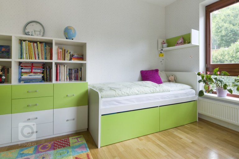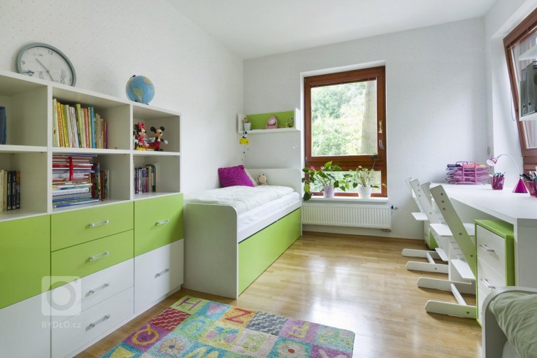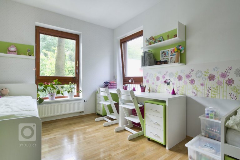 Tento dětský pokojíček vznikl na přání dvou holčiček, které jsou ve věku 6 a 11 let. I přesto, že holčičky jsou ještě docela malé, tak byl požadavek udělat pokojíček tak, aby jim vydržel až do studentského věku. Kupodivu nechtěly ani moc růžové, ale akcent jsem tam přeci jen v podobě kytiček, pro mě rozkvetlé louky dala, aby se celá atmosvéra pokoje zjemnila. Na fotkách to asi není moc zřejmé, ale naproti pásu kytek je použita tapeta s puntíkama, velmi jemnýma, který dodají pokoji na romantice. Celý nábytek se vyráběl na zakázku. Nejprve bylo i víc variant postelí do výšky, ale nakonec vyhrála varianta, kdy obě holky mají postel na zemi a velikost odpovídá již dospělému lůžku.