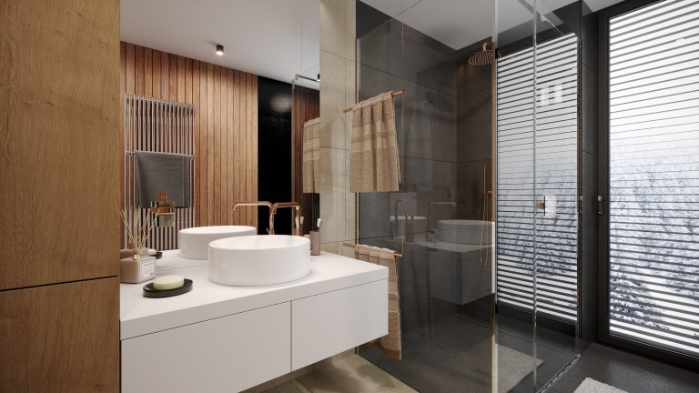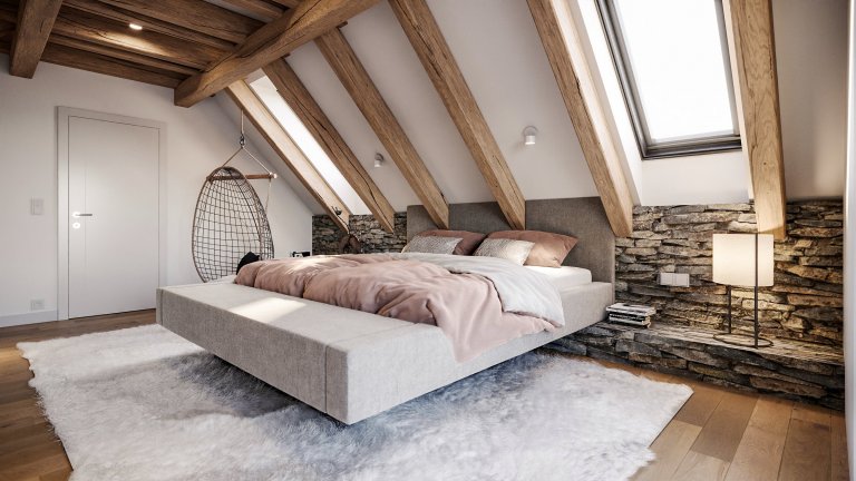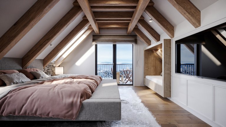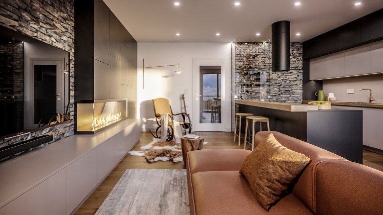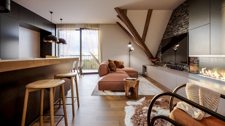 Hlavním motivem tohoto interiéru bylo horské prostředí. Hlavní roli zde hraje mírně rustikální dřevo, kámen a také antracitový, respektive bílý nábytek. V interiéru je přiznána dřevěná konstrukce krovu. Útulnost obytným místnostem dodávají kožešiny a kusové koberce.
