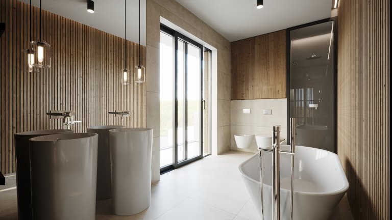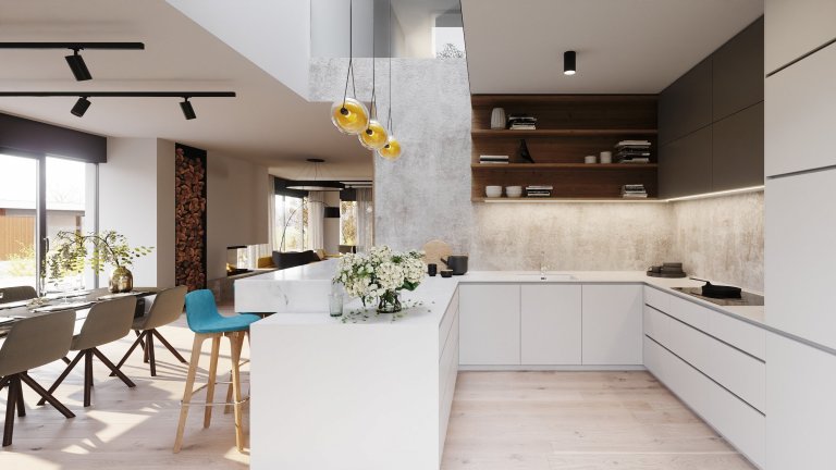 Interiér projektu Na Meandru vychází z architektury a konceptu celého developerského projektu. Design domů je inspirován přírodou a sluncem a zároveň ale i futuristickou, nejmodernější architekturou.