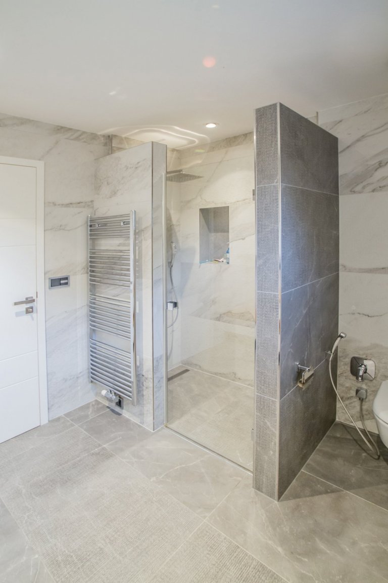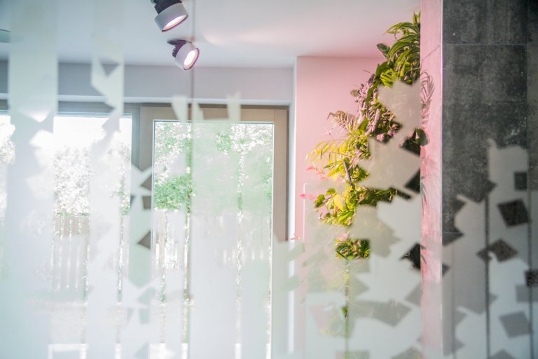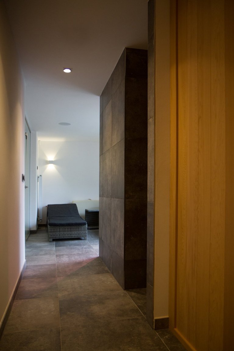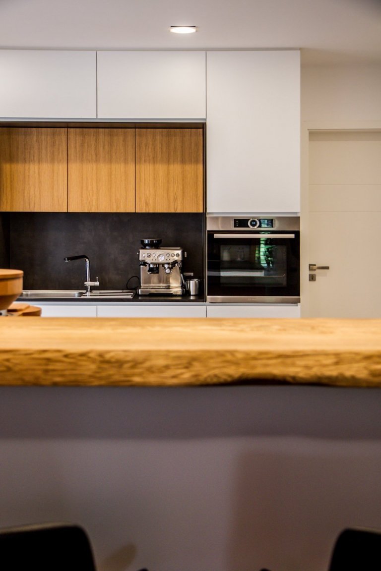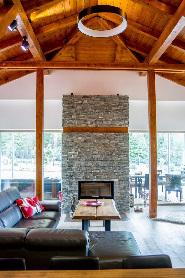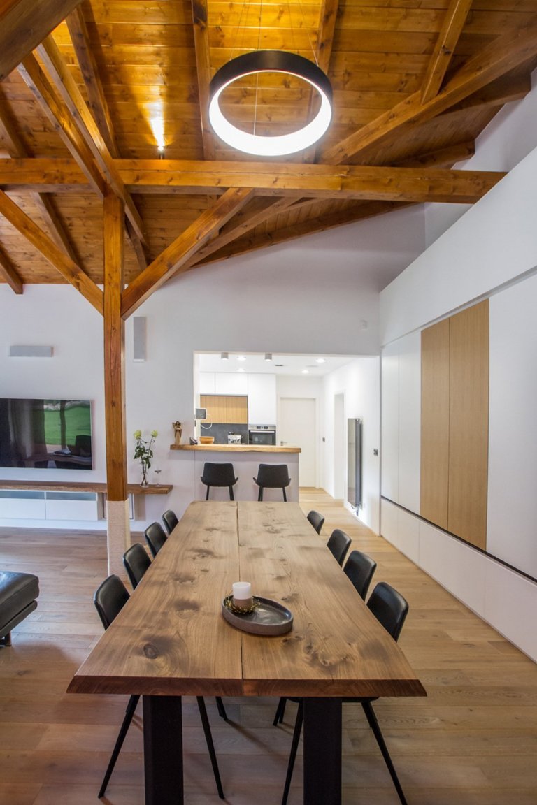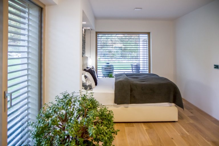 Interiér pasivního dvougeneračního domu byl od počátku pojat velkoryse s odkazem na téma přírody. Samotná stavba se pyšní obrovskými dřevěnými krovy a přírodním kamenným obkladem. Nábytek je kombinacemi bílé, dubové a antracitové barvy. Téma stromu/přírody se opakuje v několika detailech. Příkladem jsou: grafický potisk skleněné stěny, který znázorňuje mihotání listů stromů, jídelní stůl, který je tvořen rustikální dřevěnou deskou, vegetační stěny, použití cortenu na krbu, který evokuje barvu podzimního listí a další.