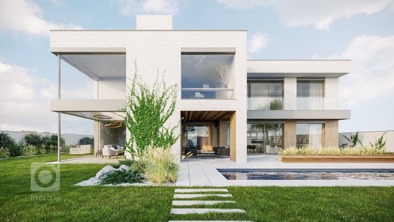 Hlavními prostory domu jsou velká kuchyně s jídelnou, která je oddělená od obývacího prostoru s krbem. Obývací pokoj je otevřen do patra a prosklen rohovým zasklením v obou podlažích. Hlavní obytné plochy jsou obráceny do prostorné terasy v přízemí a v horním patře na balkón. Vstup do domu je…