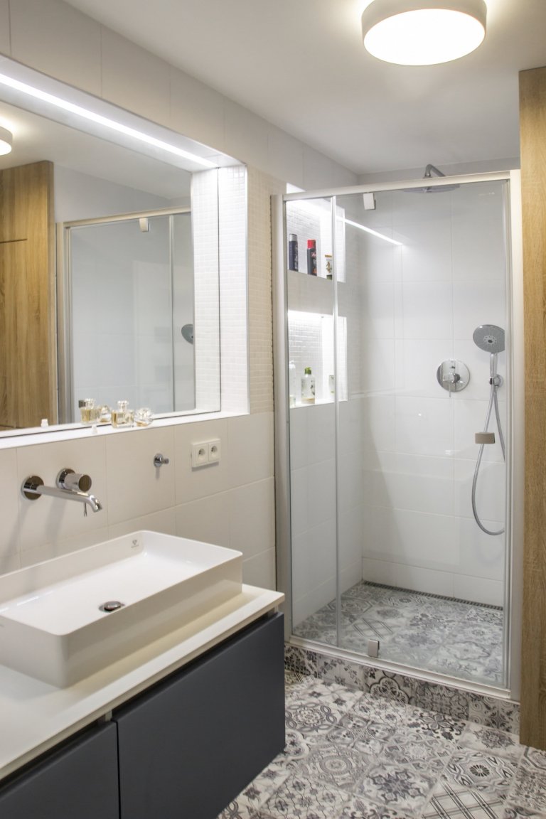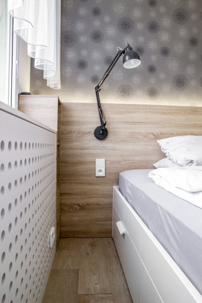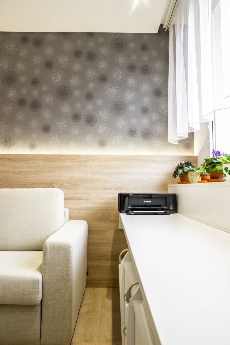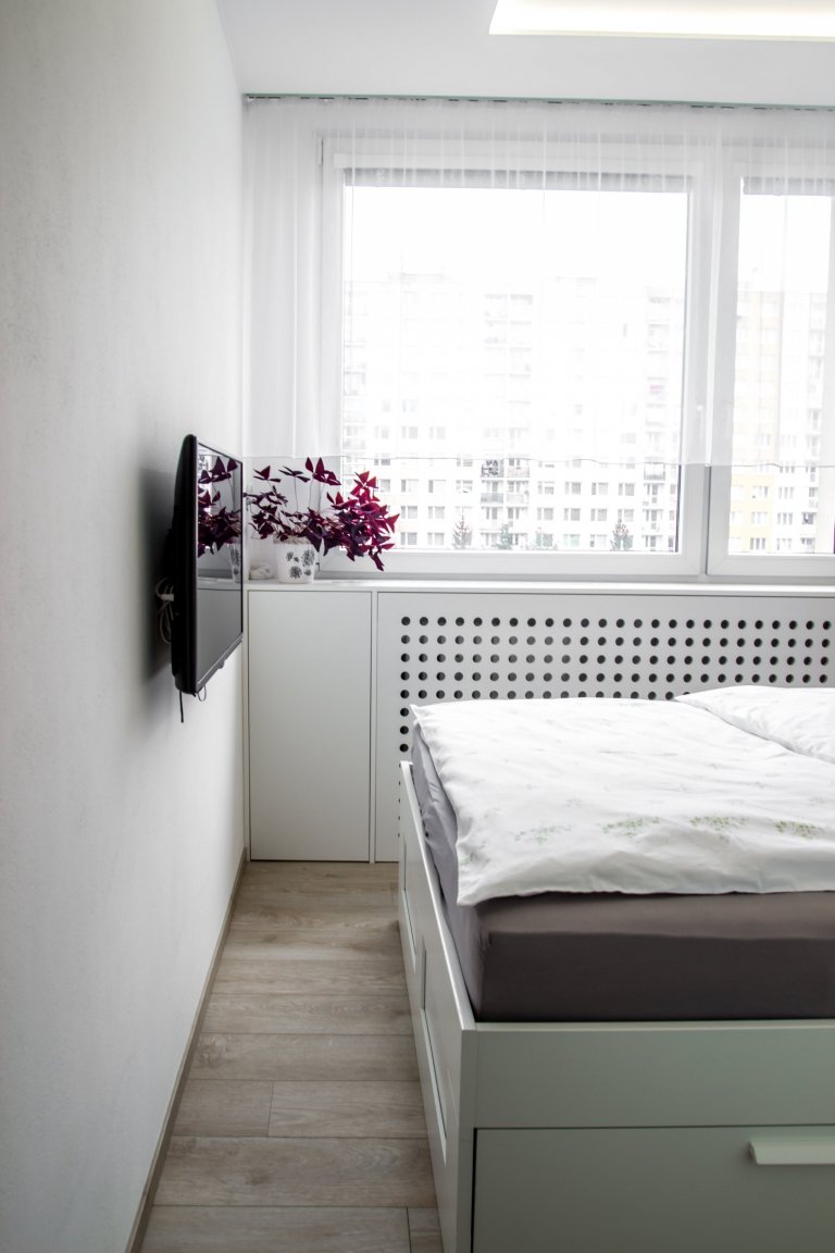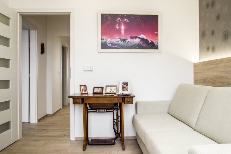 Rekonstrukce bytu v panelovém domě se nesla ve znamení velké změny. Majitelka měla jasno, chtěla svůj byt zesvětlit, zmodernizovat a zbavit ho starého vybavení, které už morálně odsloužilo. Největší změnou bylo odstranění příčky mezi kuchyní a obývacím prostorem. Vznikl tak jeden kontinuální prostor, který umožnil umístění pultu a pohovky do prostoru. Materiálové řešení celého bytu spočívá ve světlých barvách, přírodním dřevu a jemných odstínech růžové s šedou.