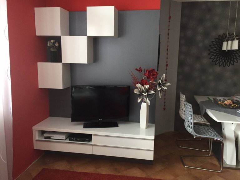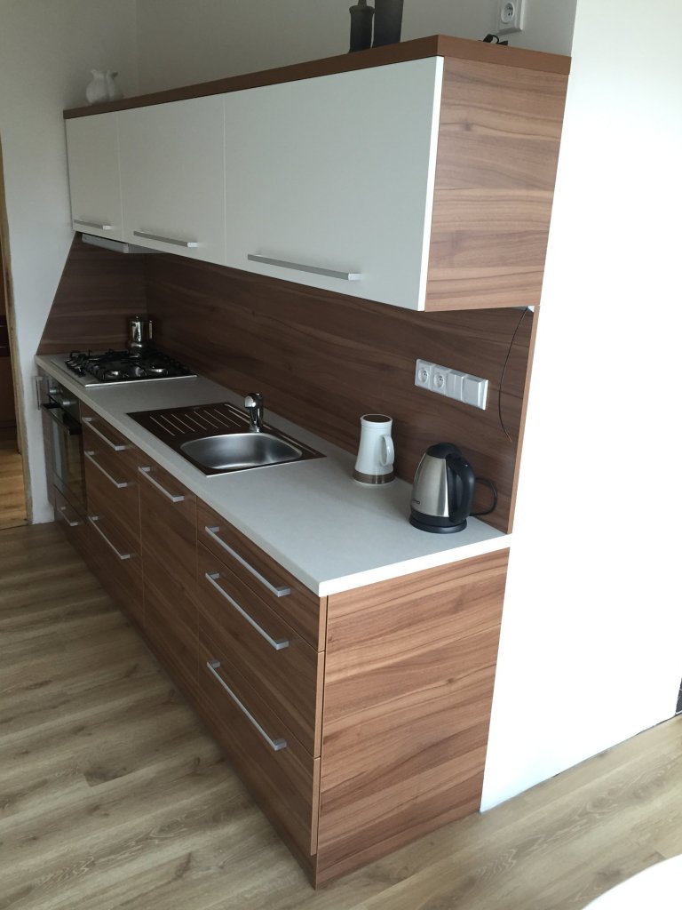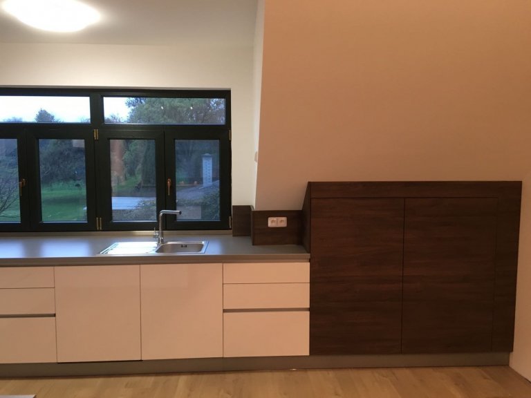 Linka v podkrovním bytě je řešena bezuchytkovým provedením a s dvířky v bílém vysokém lesku