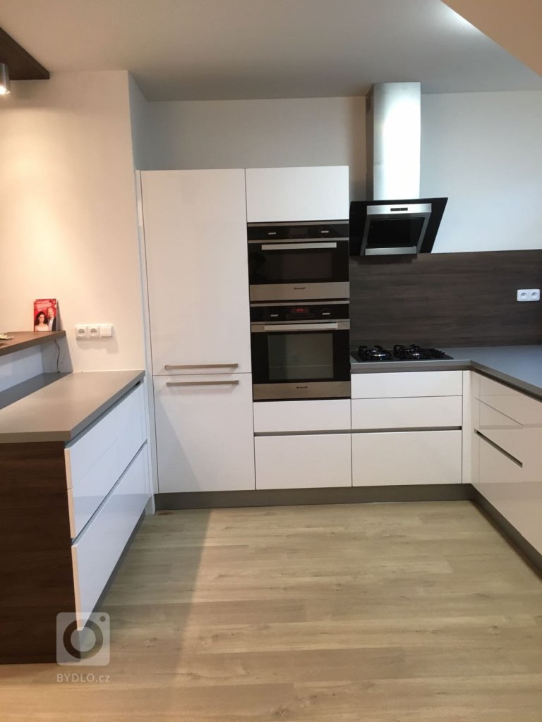Linka v podkrovním bytě je řešena bezuchytkovým provedením a s dvířky v bílém vysokém lesku