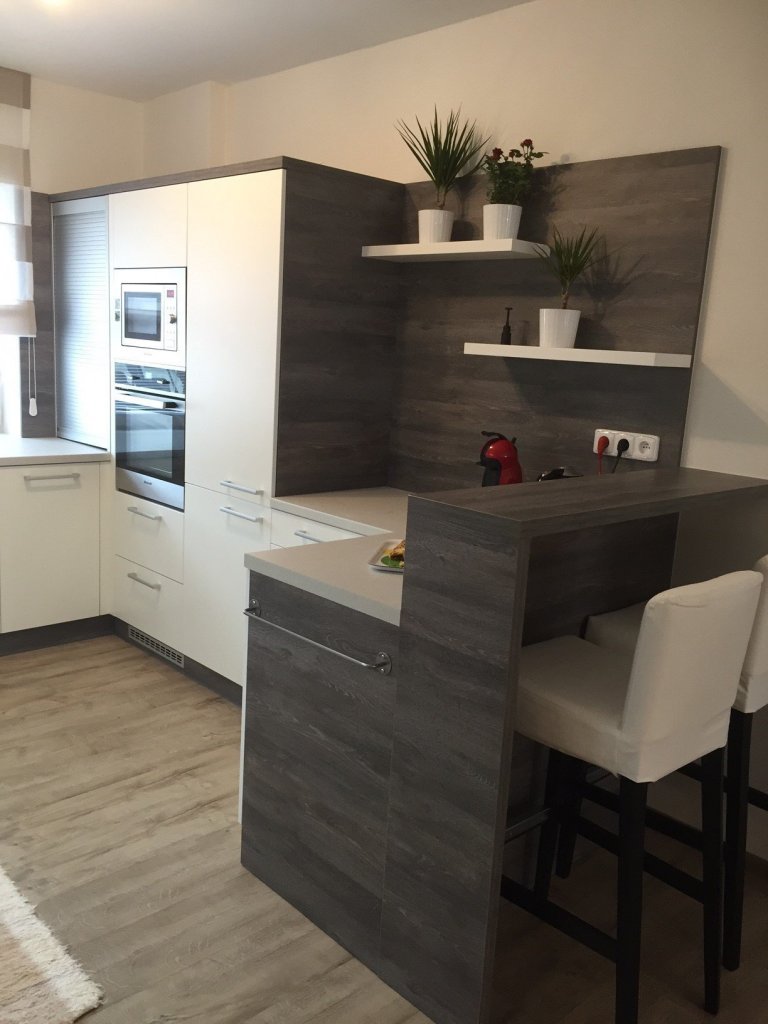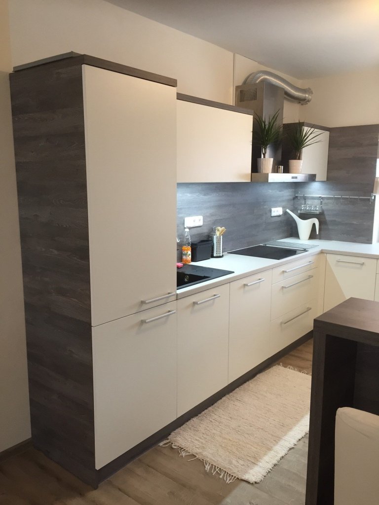 Plně vybavená kuchyňská linka ve tvaru U doplněný dělícím barovým pultem. Na přání klientky jsou zde řešené plně využitelné úložné rohové prostory a rovněž je součástí linky i potravinová výsuvná skříň fa BLUM a praktická nerezová roletka. Na osvětlení pracovní desky je použit LED diodový pásek s vysokou svítivostí.