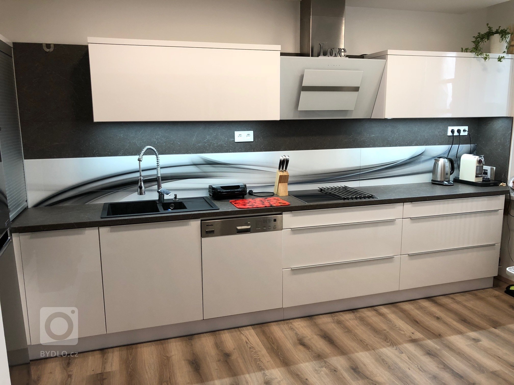 Kuchyňká linka v bílém vysokém lesku s grafosklem, osazená spotřebiči Bosch a doplněná příruční stolovou deskou zabudovanou do skříňkové sestavy protilinky.