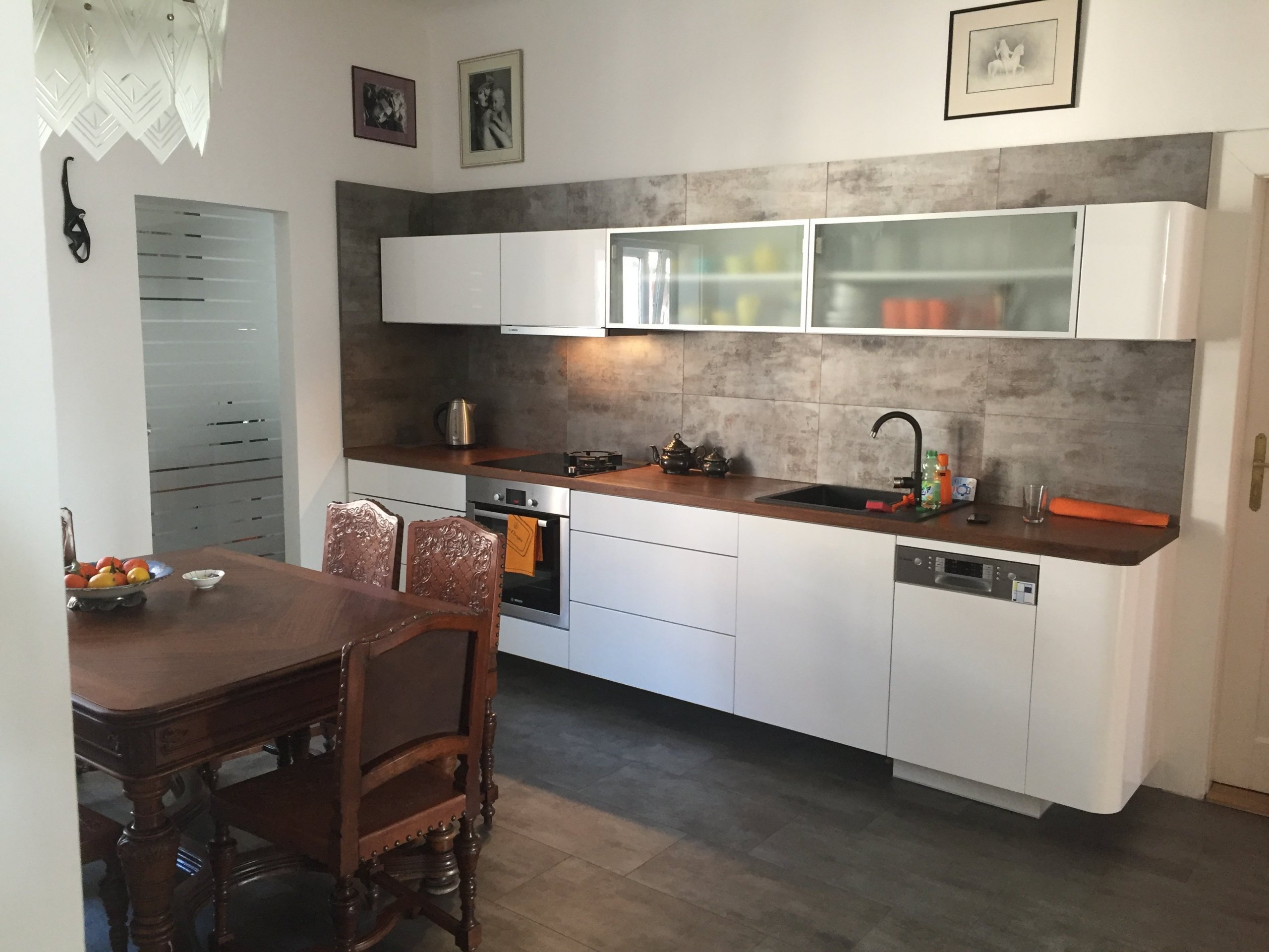 Kuchyňská linka v bílém vysokém lesku doplněná masivní pracovní deskou. V kuchyni je umístěn námi renovovaný starožitný stůl s židlemi a konferenční stolek.