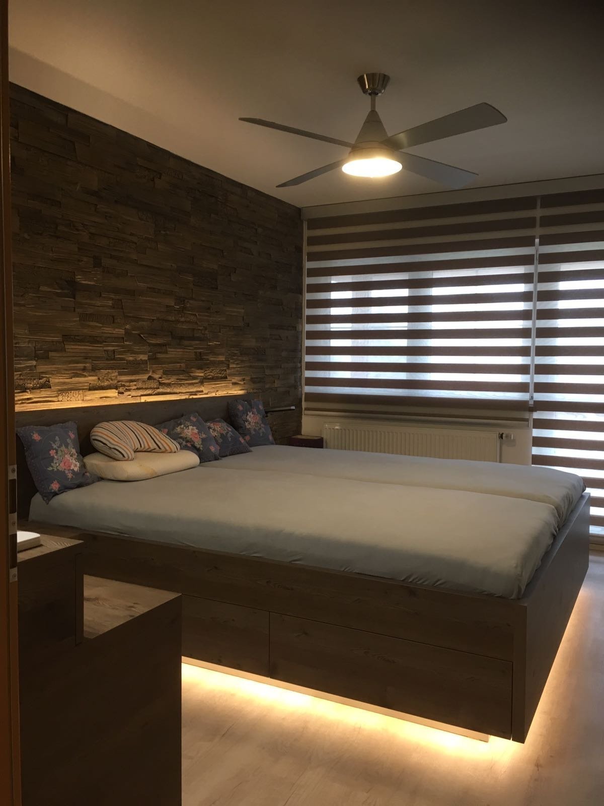 ložnice na míru s toaletním stolkem a břidlicovým obkladem doplněná LED diodovým podsvětlením postele a zabudované niky. Na oknech jsou osazeny oblíbené designové Duo rolety.