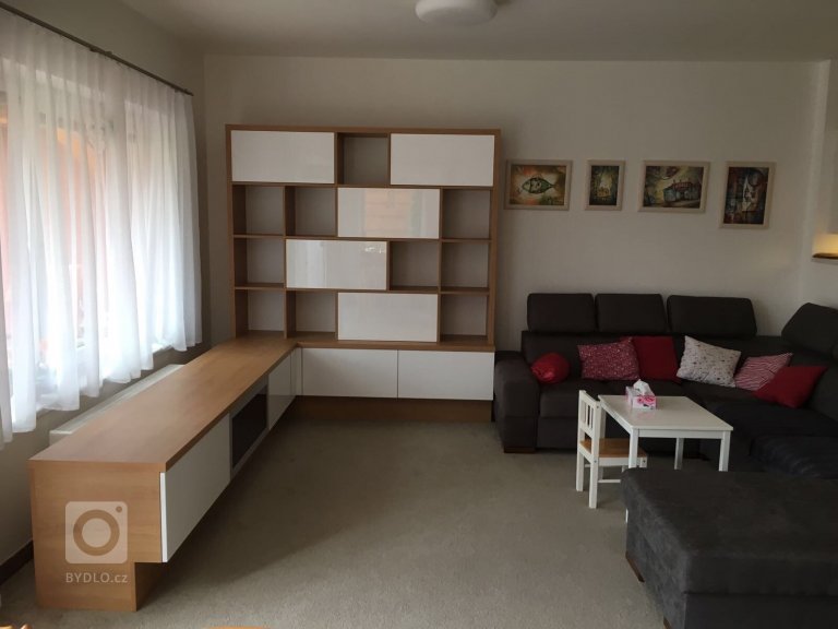 obývací stěna s jídelnou v bílém vysokém lesku a přírodní dubové dýze