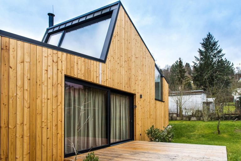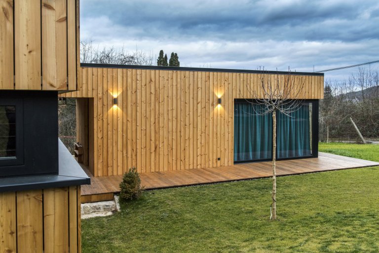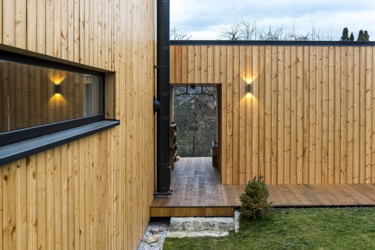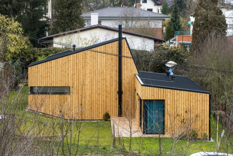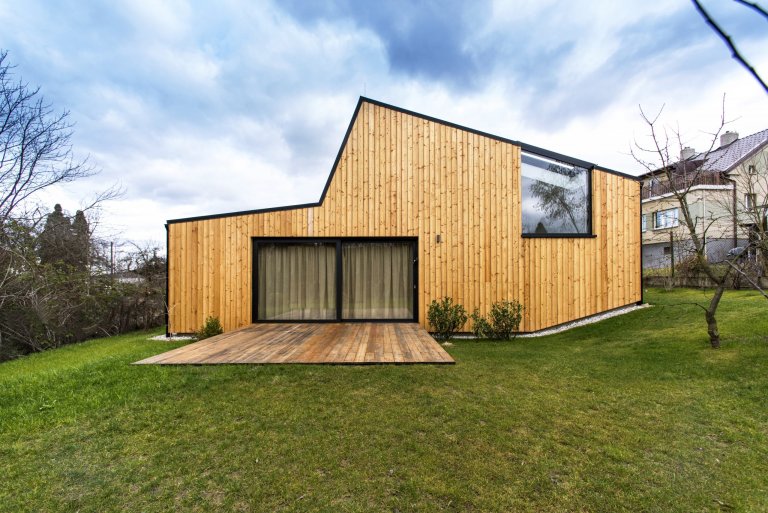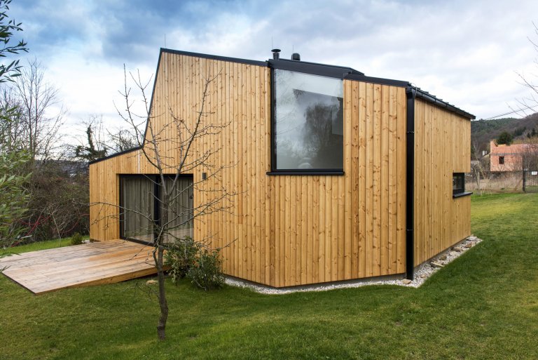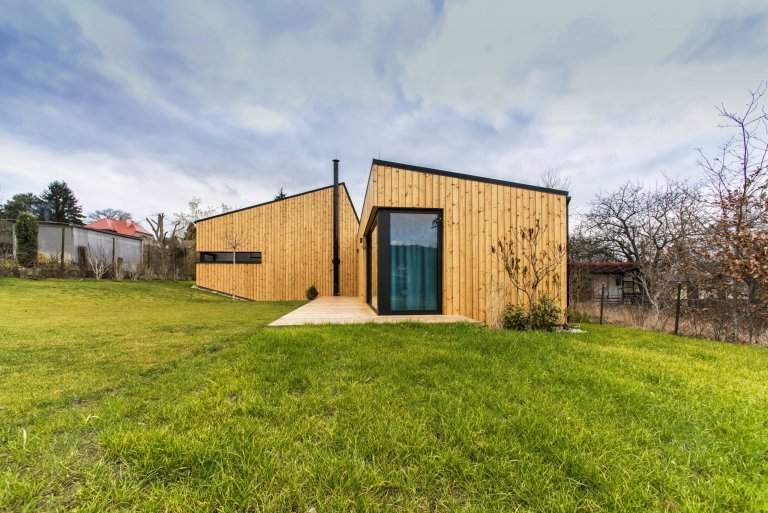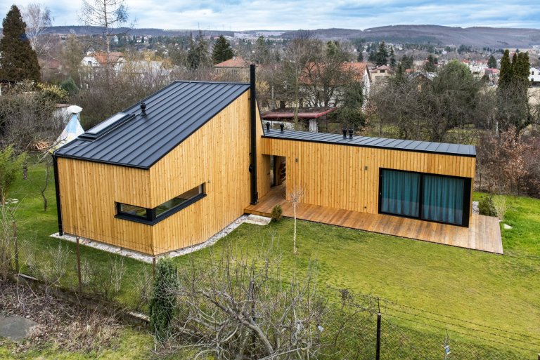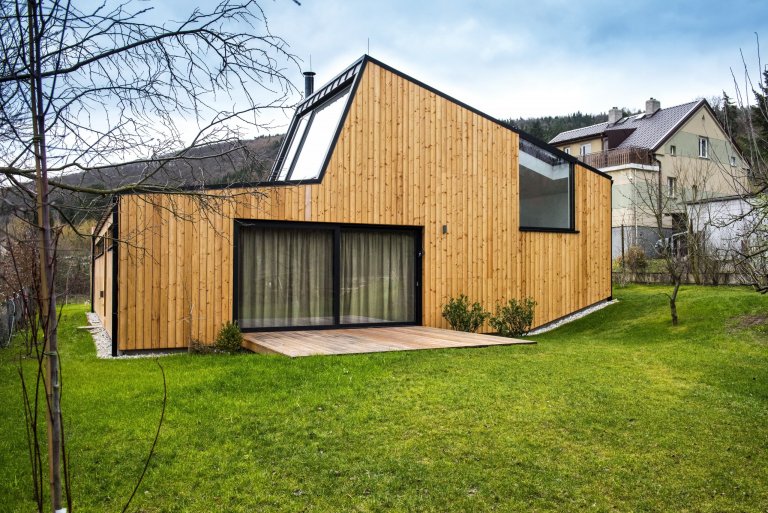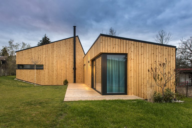 Nízkoenergetická dřevostavba ve tvaru písmene L je umístěna tak, aby měla co největší přísun slunečního světla. Dům se skládá ze dvou objektů s rozdílnými sklony střech, které ale díky jednotnému obkladu z modřínových latí působí jako jednotný celek. Jednopodlažní část obývají starší rodiče, vyšší dvoupodlažní část s proskleným „zubem“ střechy slouží mladé rodině s dětmi. Díky umístění stavby uprostřed pozemku došlo k rozdělení zahrady do dvou částí, které přiléhají k odděleným částem domu.
