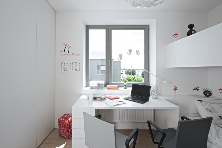 Vzhledem ke skromným rozměrům pokoje bylo od počátku jasné že bude zapotřebí použít palandu. Ta zabírá celou kratší stěnu pokoje tak, že je umístěna de facto ode zdi ke zdi a plynule na ní navazuje knihovna. Stůl byl situován standardně pod okno, jehož šířku přesně kopíruje. Poslední volnou stěnu zabírá šatní skříň, opět vyrobená truhláři atypově na míru a podle potřeb dospívajících dívek.
