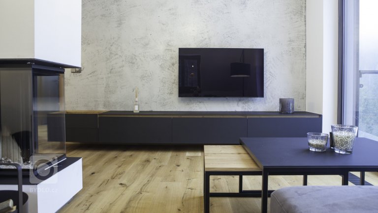 Ložnice rodičů a koupelna tvoří velkorysý prostor s minimem nábytku. Koupelna je od ložnice oddělená skleněnou stěnou. V kuchyni matná šedá a černá příjemně kontrastuje s dubovou podlahou a betonovou stěrkou na stěnách. Díky voděodolné stěrce není nutný obklad stěny. Subtilní ostrůvek…