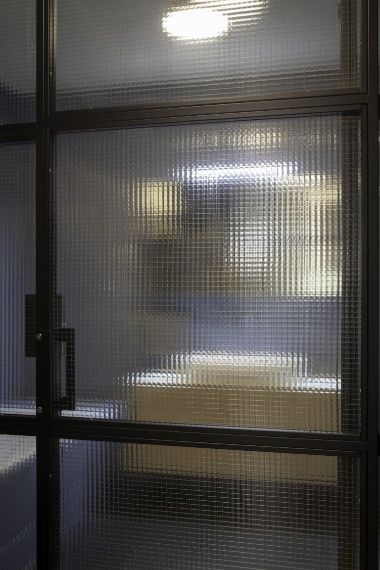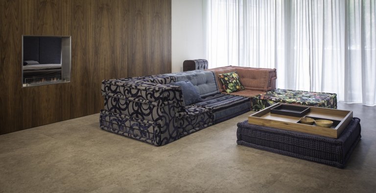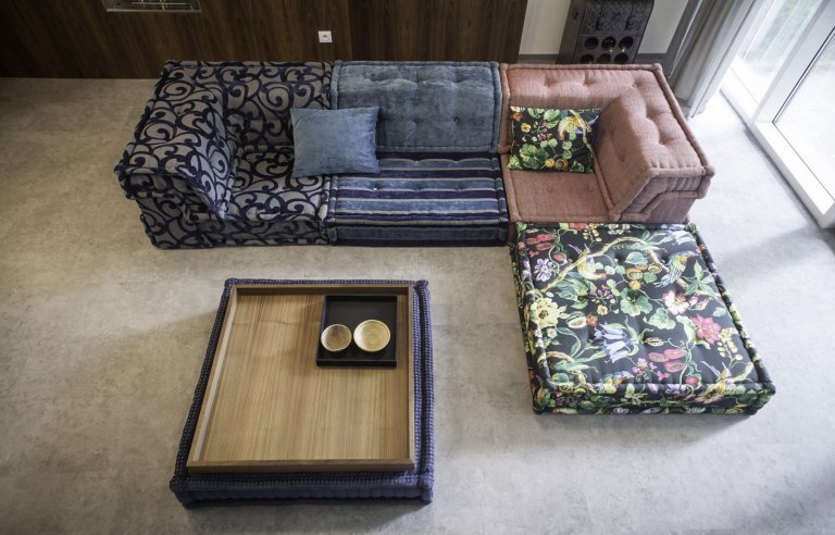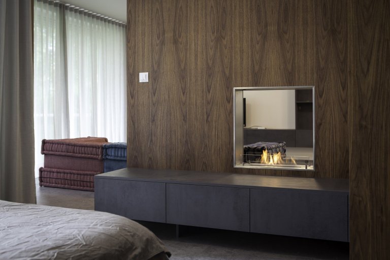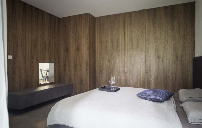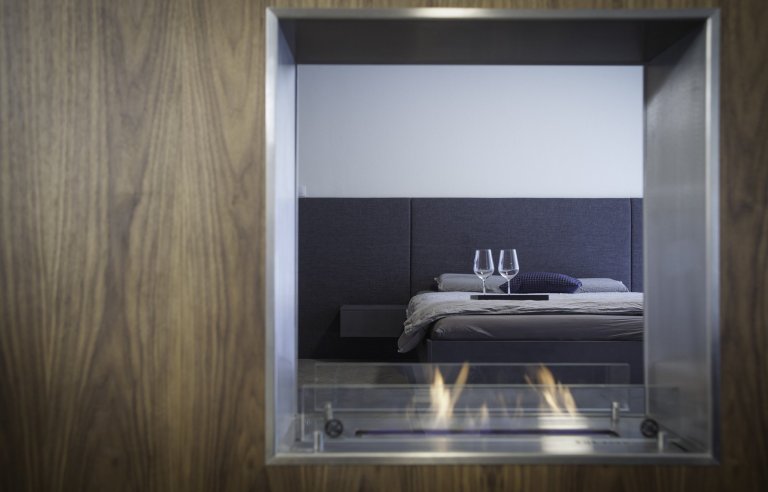 Eklektická pohovka zhotovená na míru pro tento prostor kombinuje několik zdánlivě nesourodých vzorů a textur. Sedáky lze oddělit od opěráků a slouží jako velkorysé spaní pro hosty. Do stěny mezi ložnicí a obývacím prostorem je osazen oboustranný lihový krb. Koupelna a toalety je oddělena stěnou z drátěného skla.