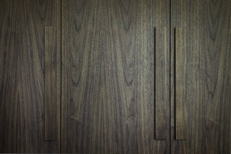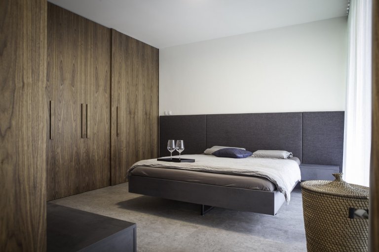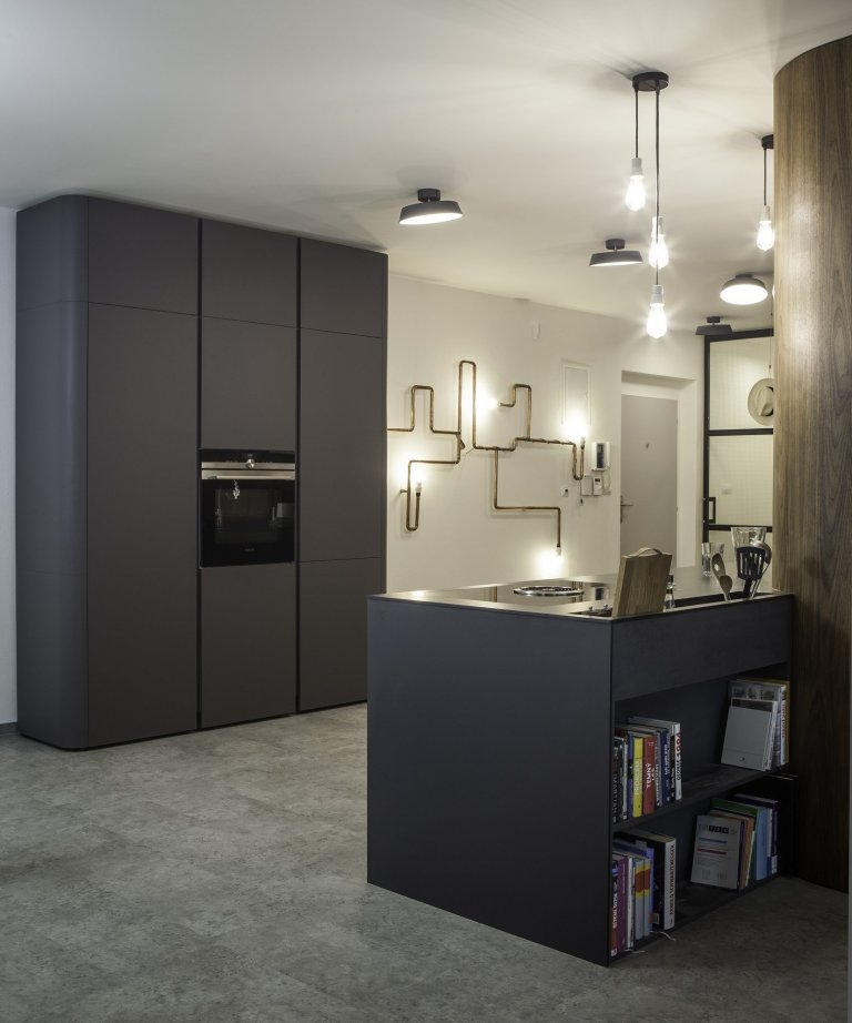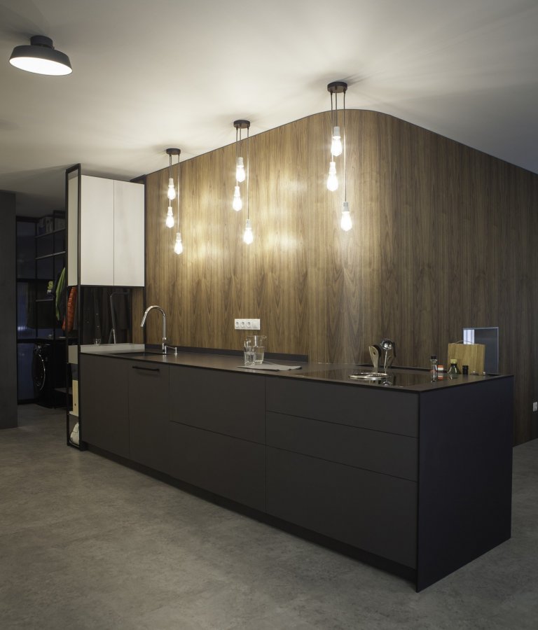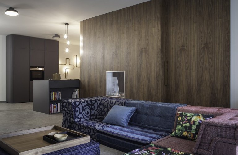 Všechny stěny jsme zbourali, postavili jsme pouze jednu nábytkovou příčku, která obsahuje úložné prostory a zároveň kryje vodo a elektroinstalace. Na velkých plochách skvěle vynikne struktura přírodní ořechové dýhy.