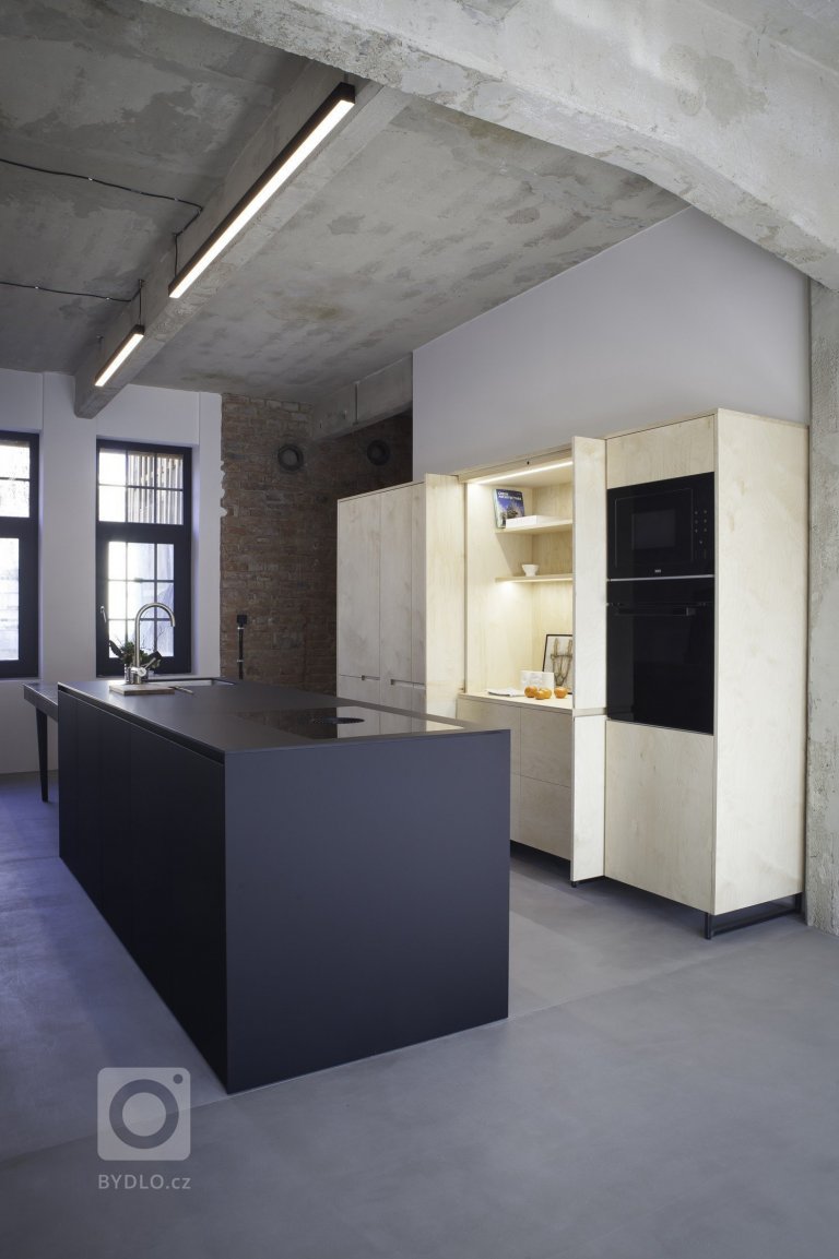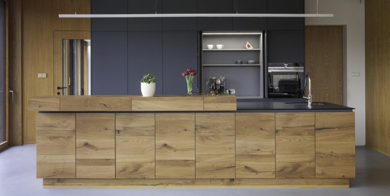 Nábytek v kuchyni jsme navrhli z odolného ultramatného laminátu se sametovým povrchem, na kterém nejsou vidět otisky prstů.