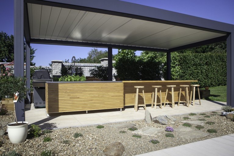 Kuchyň je osazena digestoří BORA s odtahem ven. Prostor nad hlavou a výhled do obývací části je tak volný.