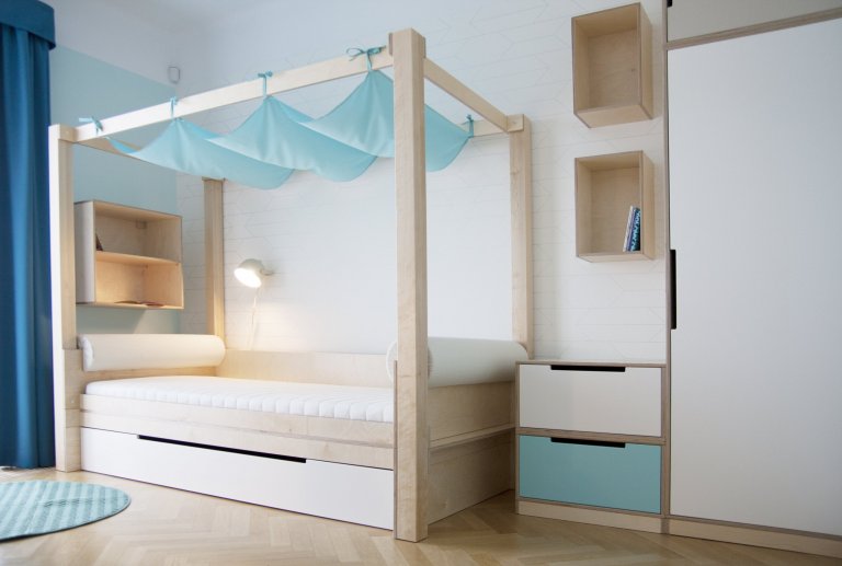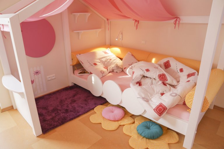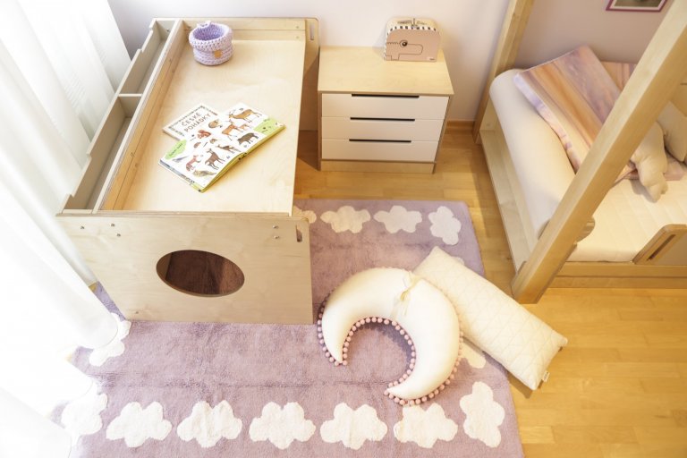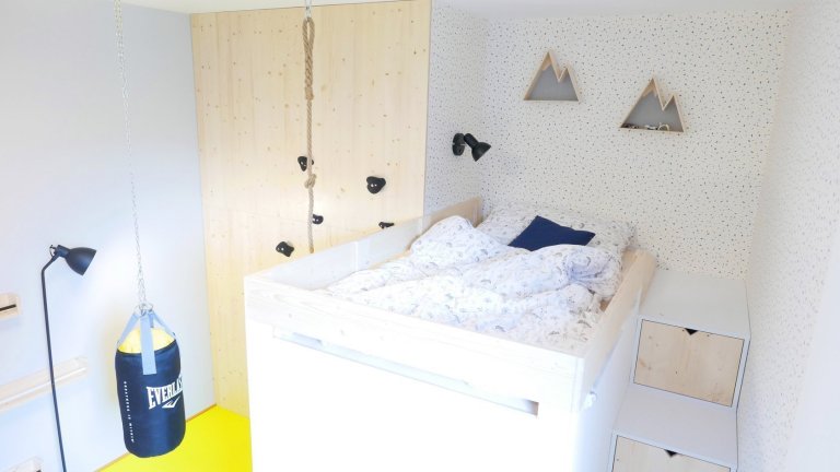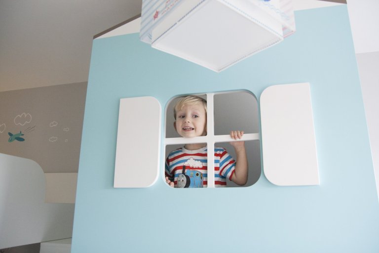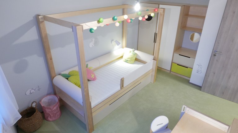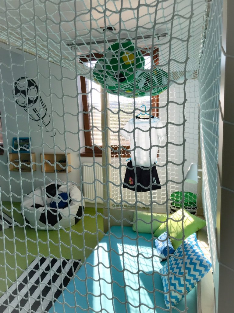 Dětský pokoj lze přizpůsobit každému koníčku našich dětí. Například ve spolupráci se společností KINDER jsme proměnili dětský pokoj ve fotbalové hřiště. Rostoucí kvalitní nábytek, který zůstane klučinovi až do studijních let, jsme doplnili výmalbou, samolepkami a dekoracemi jeho největšího koníčku a tím je fotbal! Pokoj se tak proměnil z pouhého místa na spaní v místo pro hru a kreativitu. Popisovatelný nátěr na stěně umožňuje chlapci vyjádřit své nápady a myšlenky i kolem sebe.