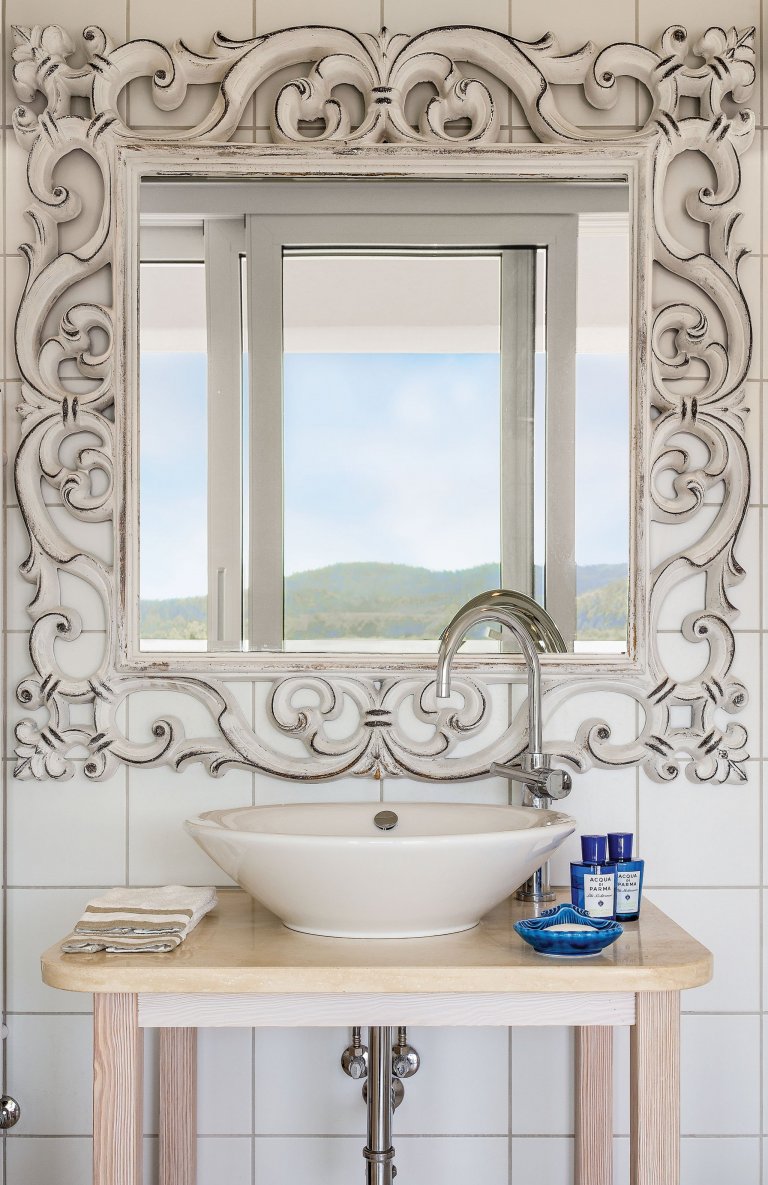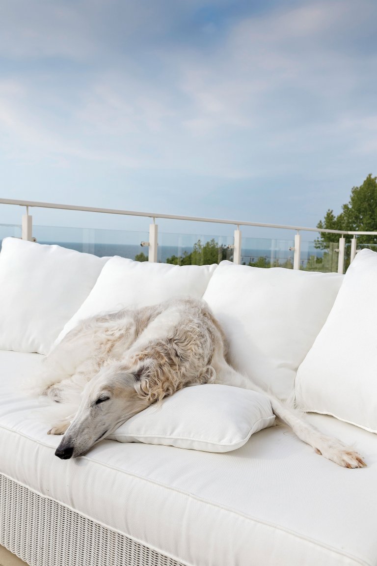 Terasa obklopuje byt ze všech stran a lze se na ni dostat z každé místnosti, a to i z koupelny. V létě není nic lepšího, než vklouznout z vany přímo na lehátko a dýchat vzduch nasycený krystaly baltského jódu. V apartmánu najdeme světelné konzole i skleněné lampy, které však dokonalému výhledu na moře nijak nebrání.