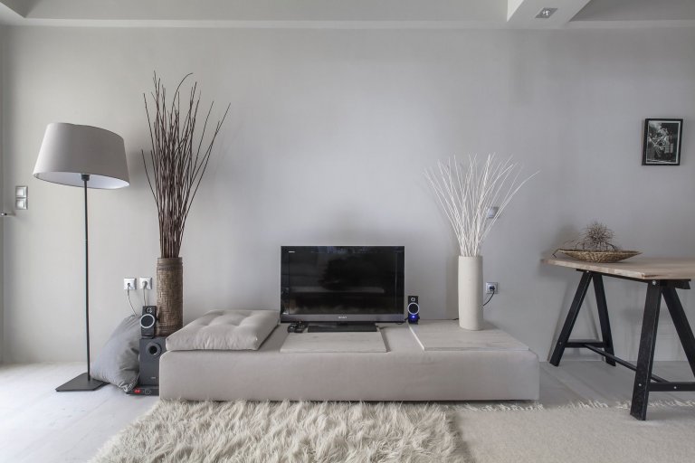 O perfektní zpracování právě takového úkolu se postarali architekti z ruského studia AD Architects, kteří v Řecku navrhli interiér, kterému dominuje pouze jedna barva, a tou je právě bílá. Ta je pro vytvoření útulného prostředí doplněna o akcenty přírodních šedých a béžových odstínů. Nejhlavnějším místem celého bytu je obývací pokoj, který zároveň slouží i jako pracovna a jídelna. Na něj navazuje kuchyňský kout, který je jednotně proveden v béžovém barevném provedení dřevěného dekoru, a koupelna s ložnicí, které jsou od hlavního obývacího pokoje odděleny skleněnými dveřmi v moderním bez zárubňovém provedení. Ty, díky svému jednoduchému vzhledu, prostor nijak nenarušuji a dodávají mu elegantní a velmi moderní nádech.