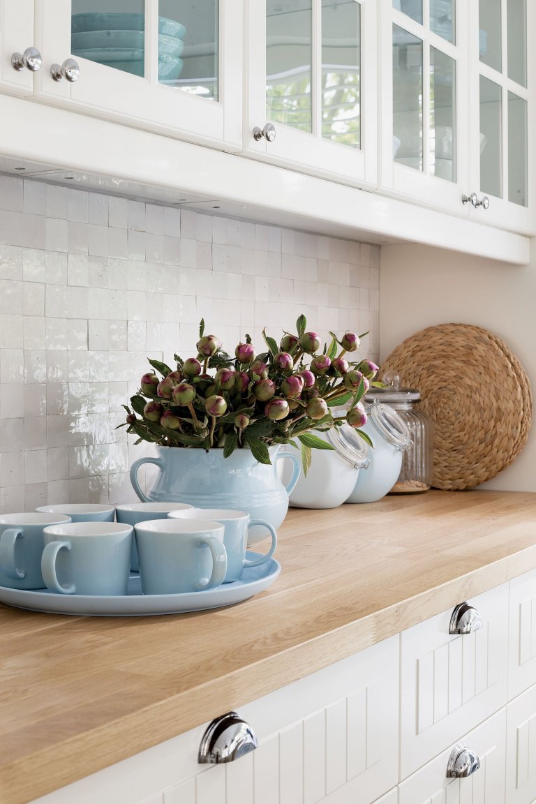 Od počátku si paní majitelka do obývacího pokoje přála dvě pohovky, které jsou potažené lněnou látkou, která je odolná, vypadá skvěle a dobře chladí za dlouhých slunných letních dnů. Originálním kouskem jsou také kachličky použité za kuchyňskou linkou. Ty byly vyrobeny ručně a dovezeny až z Belgie.