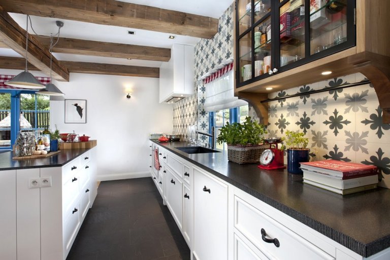 Jedná se o nezbytnou součást domu a zároveň příběh eho majitelů. Do kuchyně vedou dva vchody: první ze vstupních dveří, z prostorné haly propojené s jídelnou a obývacím pokojem se můžete v kuchyni rychle občerstvit. Druhé vám umožní rychlý přesun do jídelny, která je kombinována s útulným obývacím pokojem. Pro rodinu byl navržen velký, pevný stůl, který dává pocit stability. Pozadí stolu jsou příborníky s porcelánem, na které je radost se dívat. Mezi nimi je okno s výhledem do zahrady a bufet, kam můžete odložit to, co již nechcete na jídelním stole. Pod schody, hned za stolem, je komoda, která také tvoří předěl s horním podlažím. Je to místo pro stolní hry, ubrousky, ubrusy a svíčky.