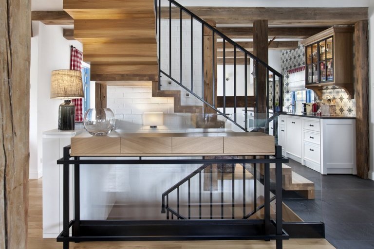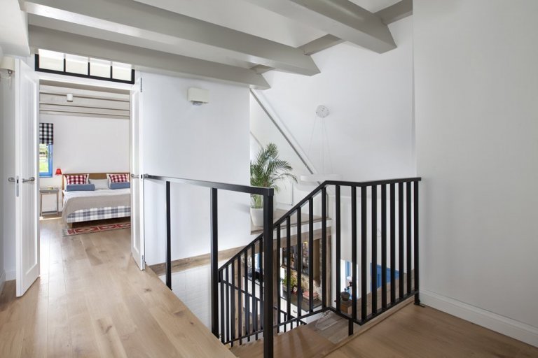 Původní schodiště bylo malé a klaustrofobní. Bylo nutné vybourat kus stropu, aby se tam vešlo plánované masivní dubové schodiště. V prvním patře je menší kuchyň/bar s kinem a kulečníkem. Právě zde se rodina schází po večeři na sklenku vína a soutěží o titul vůdce smečky.
