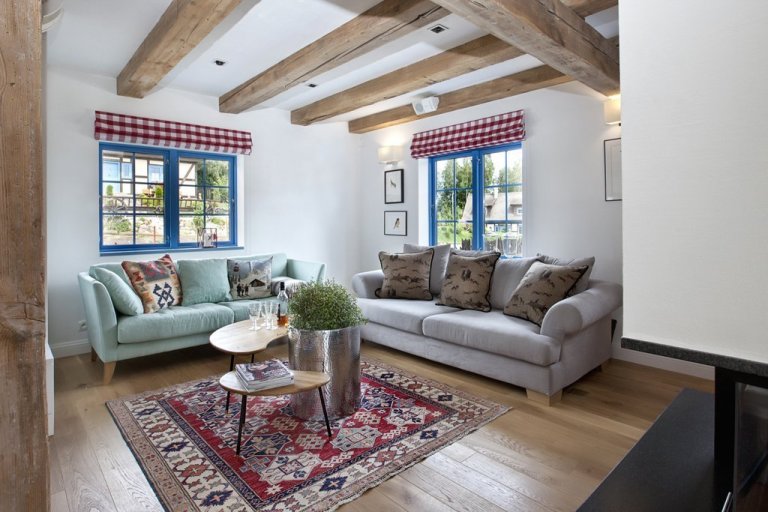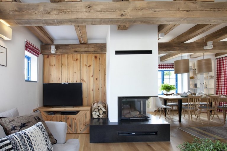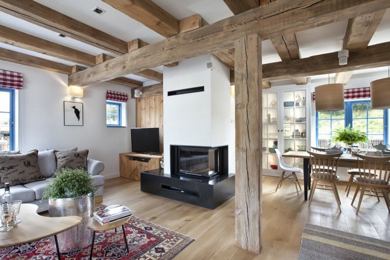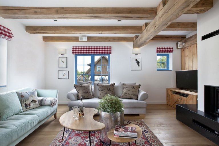 Obývací pokoj má vše, co potřebujete: dvě rohové pohovky a pohodlné křeslo. Tyto pohovky jsou záludné. Jakmile se posadíte, už se vám nebude chtít vstát. Z pohovek je částečně vidět kuchyň, krb, stůl a část ložnice, jejíž zeď v prvním patře je částečně prosklená. V rohu je místo pro vánoční stromeček, který majitelé krásně zdobí místními slaměnými ozdobami a stužkami.