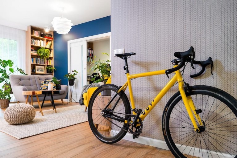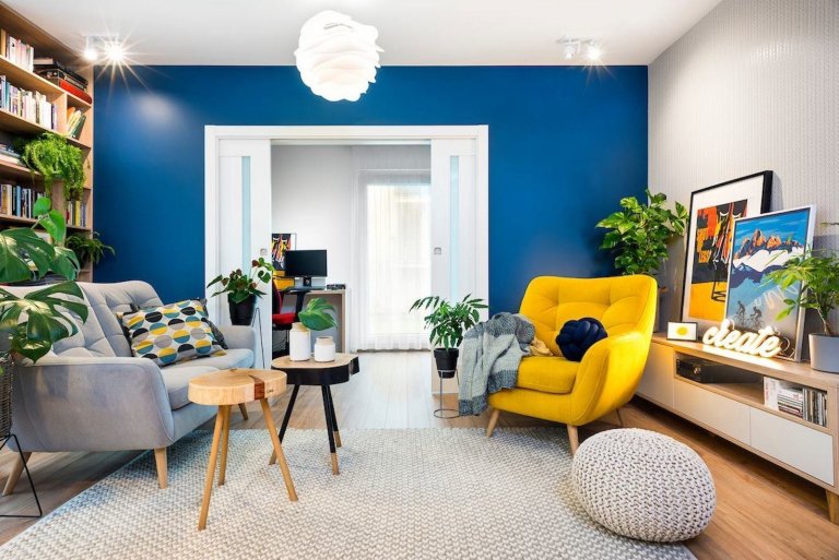 Byt je zařízen minimalisticky a převažuje v něm skandinávský styl. Ten se však vymaňuje ze své komfortní zóny a je hravější než kdy jindy. Zářivé barvy zde dostávají mnohem větší prostor, a tak na sebe pozornost strhává zejména velké žluté křeslo v obývací zóně, žluté i modré židle obklopující jídelní stůl nebo modře vymalovaná zeď uvádějící vstup do pokoje. Dvě barvy udávající tomuto interiéru tak svěží styl se pak opakují i na dalších doplňcích. Jejich zájmu neutekly ani neméně výrazné obrazy nebo jízdní kolo vyčkávající na chodbě. Výrazných prvků je tedy v interiéru celá řada, namísto divokosti však působí energicky a vesele.