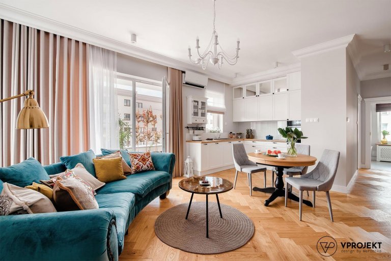 Naprosto okouzlující interiér plný barev s nádechem převážně retro a historizujícího stylu vznikl pod rukama designérky Weroniky Steffen-Lotarské, zakladatelky studia V Projekt. Zaujme svou elegancí i ryzí funkčností, které bok po boku vytvářejí pěkné i praktické bydlení. Díky použitým vysoce kvalitním materiálům působí interiér bytu přitažlivým sametovým nádechem. Vkusná kombinace barev, materiálů i tvarů v něm vytváří neobyčejnou atmosféru, která je základem pro šťastný a spokojený domov.