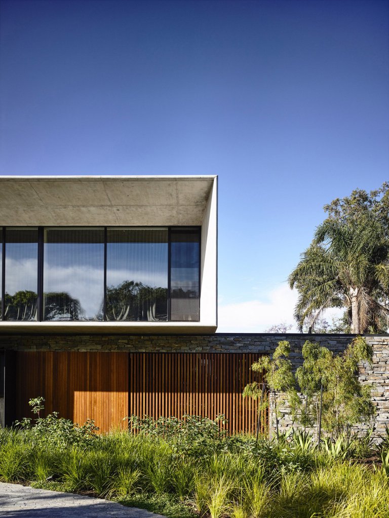 Dům byl architektonickým studiem Matt Gibson Architecture navržen tak, aby došlo k vytvoření přímého vztahu mezi interiérem a exteriérem domu. Východozápadní páteř domu tak doplňují dvě podélné prostorové zóny umístěné směrem na sever a na jih. Severní část domu funguje jako společenská, jižní pak jako soukromá. Tyto prostory jsou uspořádány kolem centrální vstupní chodby, která téměř symetricky půlí přední výšku. Přízemí je z velké části prosklené s jasně označeným ocelovým vchodem. Tato zeď nacházející se těsně pod úrovní ulice působí jako recesivní platforma, nad kterou sedí a vyčnívá konzolové první patro. Zkosený betonový tvar umožňuje maximalizaci výhledů jak směrem dopředu přes nově upravenou zahradu zahradním architektem Rickem Eckersleyem, tak dozadu směrem do ulice. Východní a západní část domu zůstala bez oken, a tak si zachovala i tolik důležité soukromí.