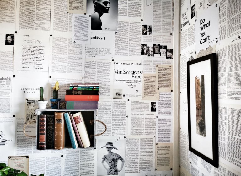 Až na výjimku, kterou s poklidnou atmosférou tvoří ložnice a koupelna, si tento interiér nepotrpí na holé zdi. Obzvláště bílá stěna za televizorem Lucii neskutečně iritovala. Po dvou letech trápení co s ní se rozhodla dát jí inteligentní rozhled. Stěna je tak nakonec plná medicínských spisů připíchnutých napínáčky. S partnerem jich pro tuhle zdlouhavou, ale navýsost kreativní práci použili rovných čtyři sta! Aby stránky z knihy nepůsobily příliš jednolitě, Lucie je sem tam ozvláštnila komiksem, fotografií z časopisu Vogue či nějakou svou ilustrací. Místo na stěně našly dokonce i některé maminčiny desky, které už nebylo možné přehrát. Fádní stěna za televizí tak získala zcela novou tvář a neskončilo jen u téhle. Lucie, jak sama říká, je posedlá barvami, a tak lakuje a natírá, co se dá. Stěny v kuchyni a na chodbě tudíž oblékla do barev tyrkysové trikolóry. Černé stěny bytu je zase díky tabulové barvě možné osvěžit obrázky a nápisy. A protože Lucie ráda a krásně maluje, stěny jejího a Martinova společného bydlení tvoří i taková její malá soukromá výstava autorských obrazů.