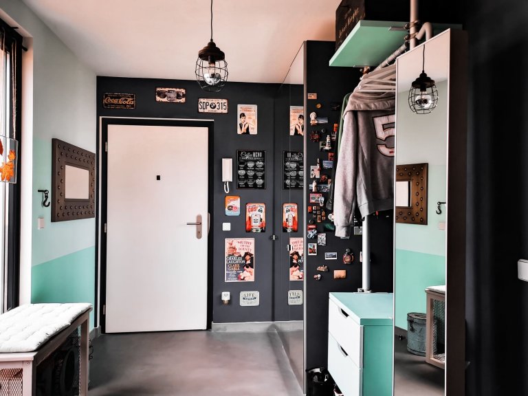 Byt byl od samého počátku nepopsaným listem. Vše přicházelo podle představ s ohledem na racionální řešení a formovalo se za chodu. Vedle kreativní stěny za televizorem či novým způsobem využitého klavíru si mladý pár nadšenců poradil také s dalšími prvky v interiéru. S vervou sobě vlastní se pustil například do lité podlahy, kterou záměrně zdobí šmouhy. Snaha o jistou nedokonalost, v níž tkví ta pravá krása, je přitom znát napříč celým interiérem. Dalším zajímavým řešením je lavice vyrobená z psacího stolu a pletiva, která důmyslně zakrývá radiátor. Zdobí ji stará plechová písmena z vintage obchodu, která si skvěle notují s industriálním nádechem v interiéru chodby. V té zaujmou i vysoké police, které slouží jako originální spíž a dotvářejí tak osobitý charakter tohoto bytu. O jeho estetickou i praktickou stránku se v neposlední řadě stará nová vinylová podlaha v koupelně, která překryla původní nepěkné obklady, na nichž byl znát každý flíček. Nejenže je teď mnohem příjemnější na dotek, ale ještě místnost určenou k očistě těla i myslí krášlí krásným dekorem.