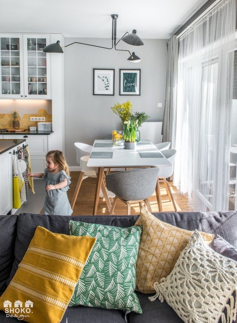 Mezi největší místnosti celého bytu patří obývací pokoj spojený s kuchyňským koutem, který v sobě perfektně kombinuje prvky jak klasického vybavení, tak moderního pojetí skandinávského stylu. To vše oživuje užití výrazných barev a motivů v textilu tak, jak je to v Boho stylu dovoleno. Celý interiér jednotí dubová dřevěná podlaha, jejíž barva a struktura se objevuje i na částech nábytku. Praktičnost dřevěné podlahy designéři obohatili o kombinaci s dlažbou, jejíž unikátní geometrický vzor je také na obložení za kuchyňským koutem a v pracovně. Za pozornost určitě stojí i koupelna, v níž se designéři nebáli kombinovat studené barvy spolu s kamenným obložením a dřevěným nábytkem.