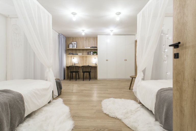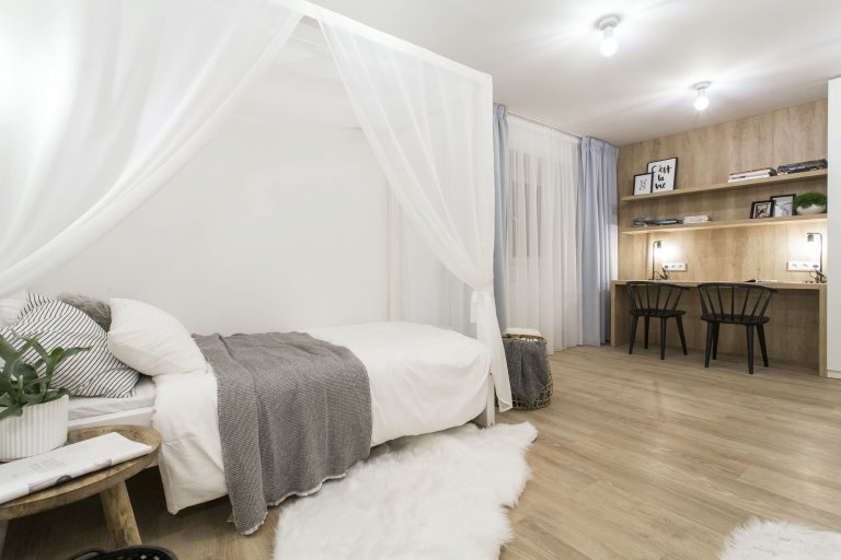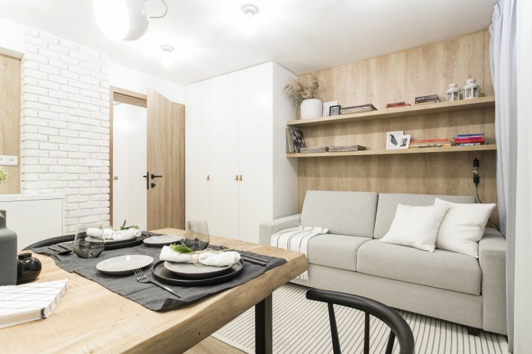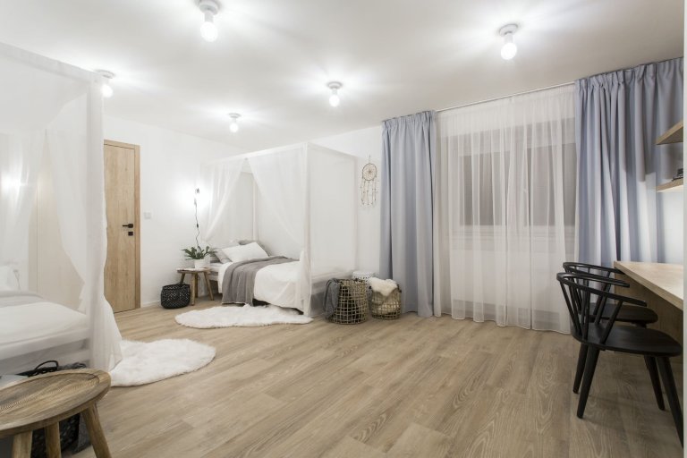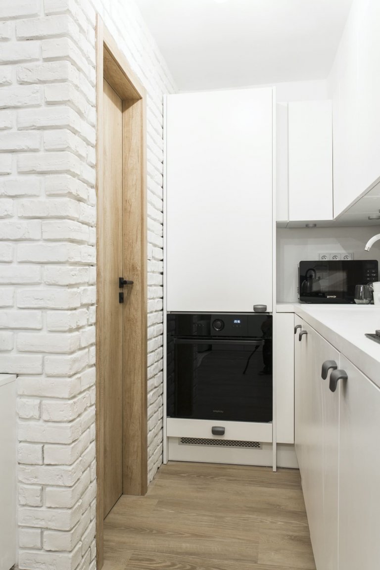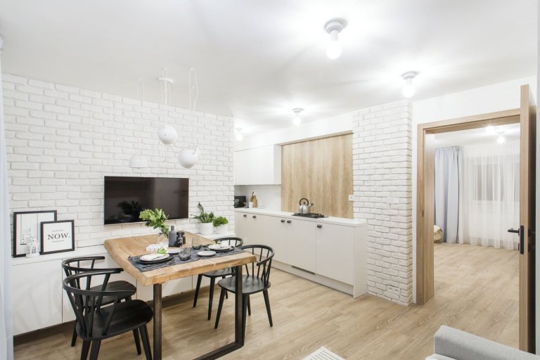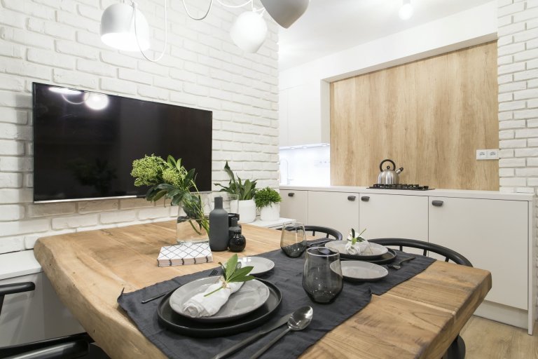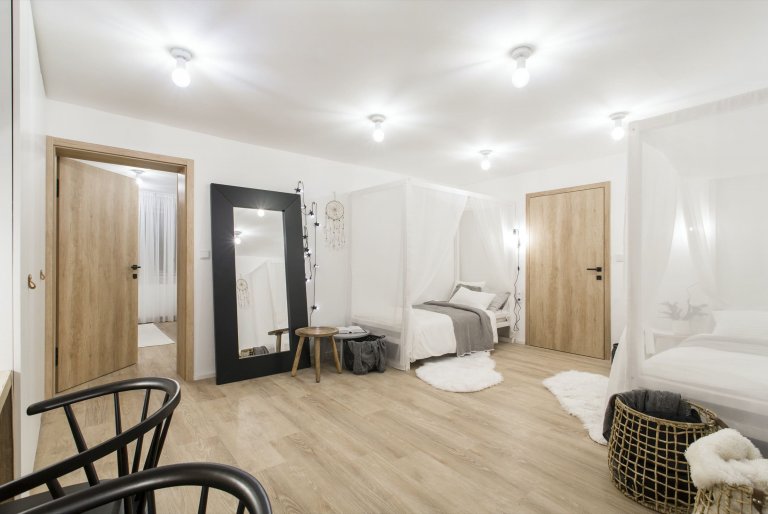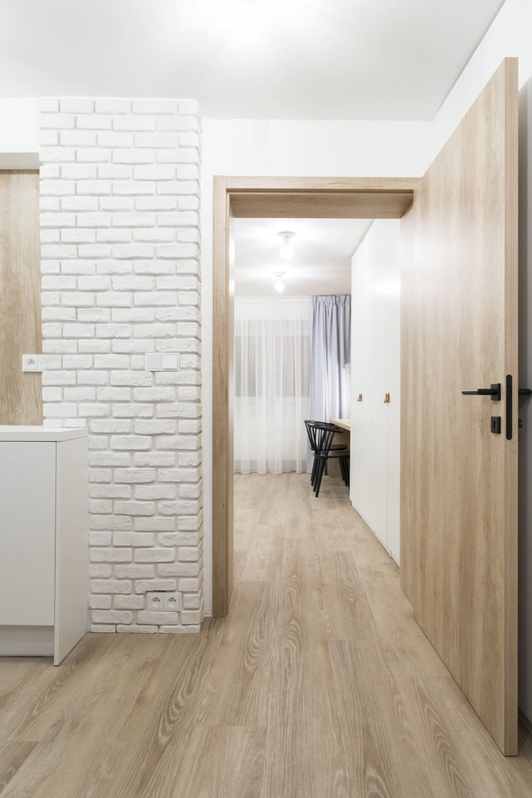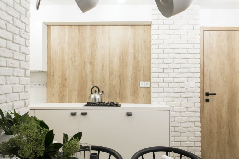 Bydlení si sice získalo novou tvář, najdou se v něm však i tradiční prvky. K těm patří obklad imitující bílé cihly, který interiéru dodává zajímavý venkovský ráz. Co se týče palety použitých barev, prim zde hraje bílá barva v kombinaci se světlými odstíny dřevodekoru a akcenty černé barvy. Pro prvky vestavného nábytku a dveře tak designéři zvolili materiál imitující dub. Bílou barvou nešetřili především kvůli malé metráži bytu. Pohráli si však s různými texturami a bytovými doplňky. Pro maminku a její tři dcery tak na přání té čtvrté vzniklo krásné bydlení plné světla, tepla a pohody.